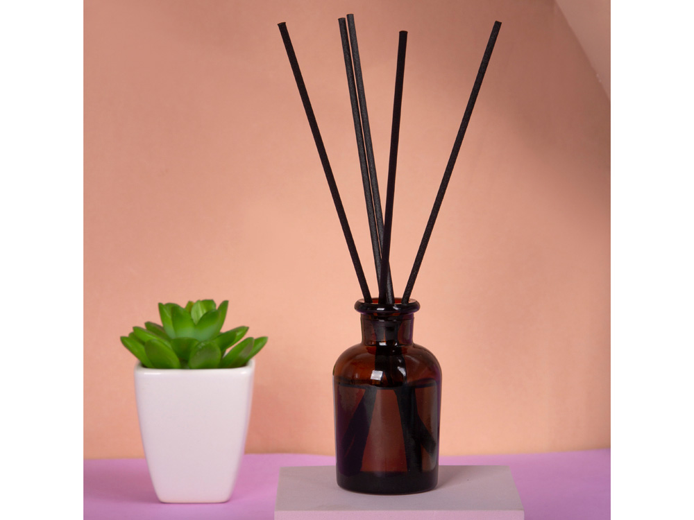 Объём диффузора 50 мл. Его будет достаточно для умеренного поддержания аромата в комнате до 15м2 в течение двух месяцев использования. Насыщенность аромата регулируется количеством используемых фибровых палочек.