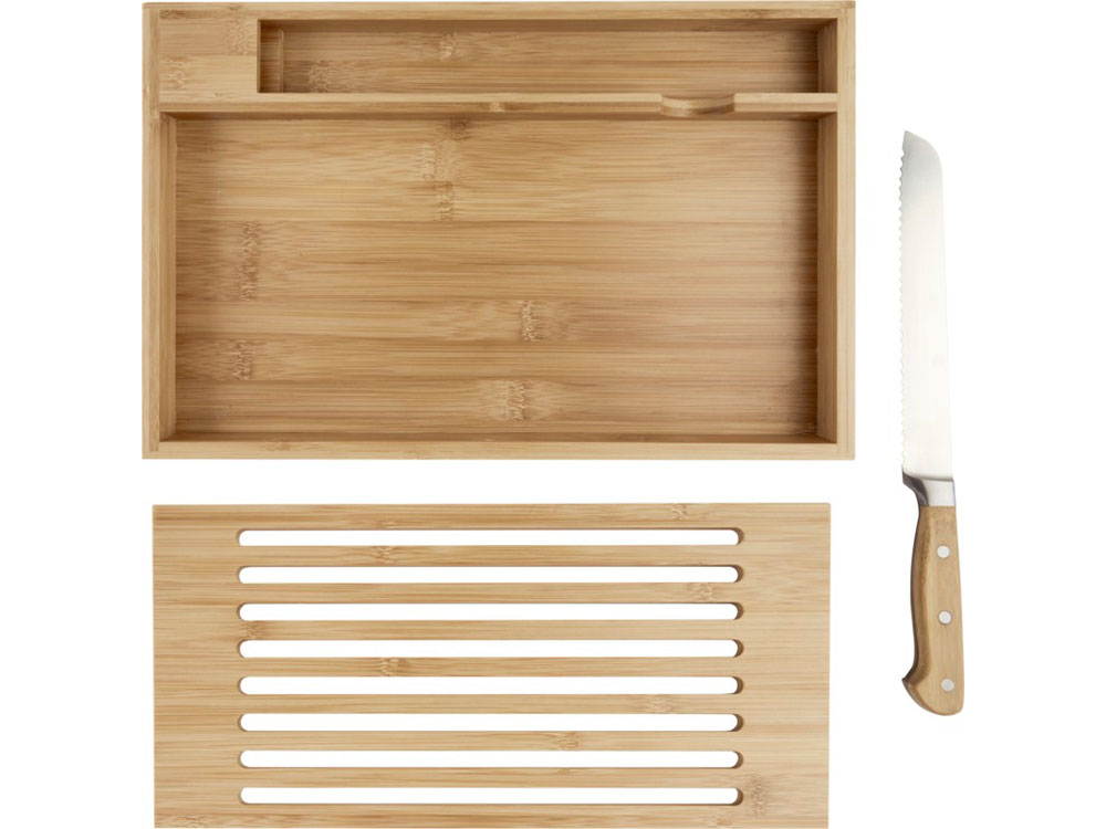 Бамбуковая разделочная доска с хлебным ножом с бамбуковыми ручками. Благодаря горизонтальной открытой модели крошки падают в поддон, что позволяет сохранить рабочее место или обеденный стол чистым. Размер ножа: 34 x 3 см. Бамбуковое дерево, нержавеющая сталь.