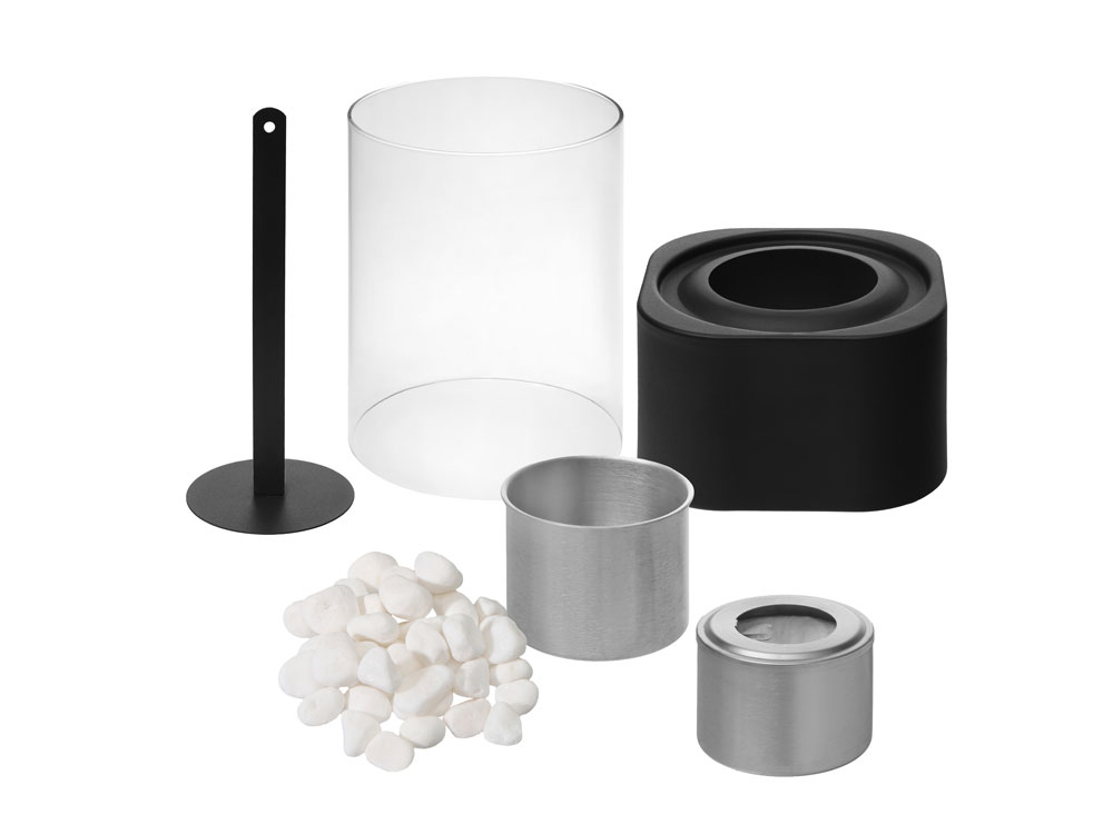 стеклянная колба из закаленного стекла, металлическая заглушка, металлическое основание, декоративные камни, емкость для биотоплива
