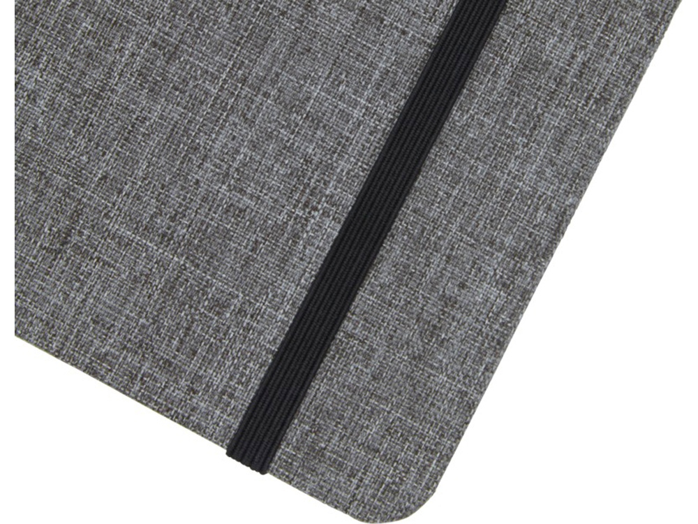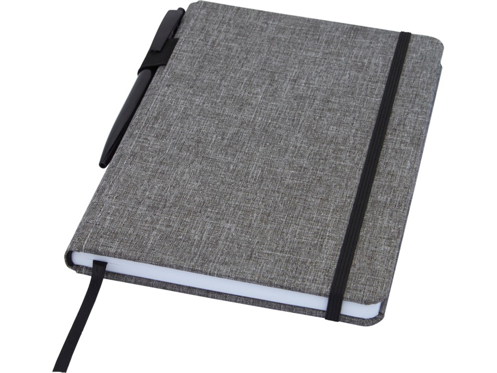 Блокнот формата А5 с отделкой из переработанного ПЭТ. Содержит 96 листов в линию плотностью 70 г/м², изготовленных из переработанной бумаги, с петлей для ручки и лентой-закладкой. В упаковке из картона.