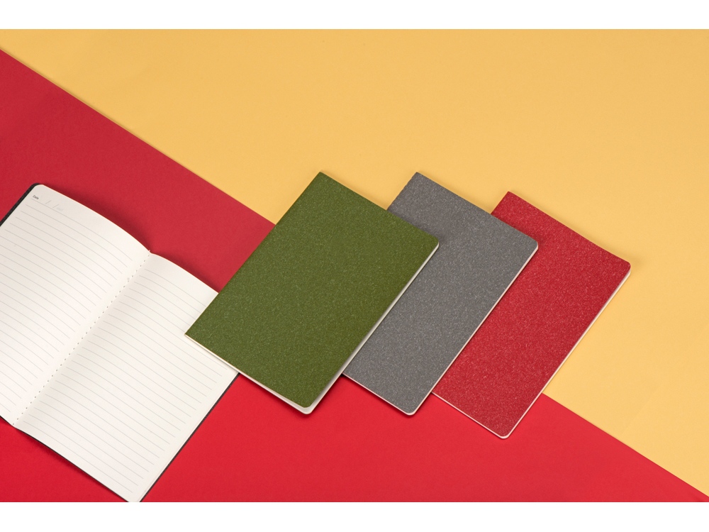 Универсальный блокнот в трендовых оттенках. Обложка матового цвета с эффектом “меланж”. Прошитый нитками блок на 60 линованных страниц.