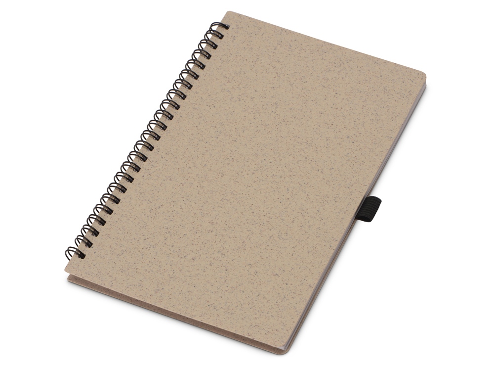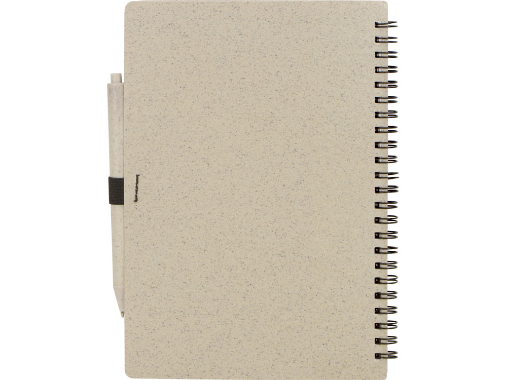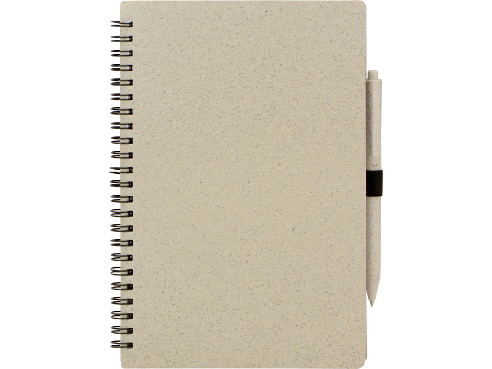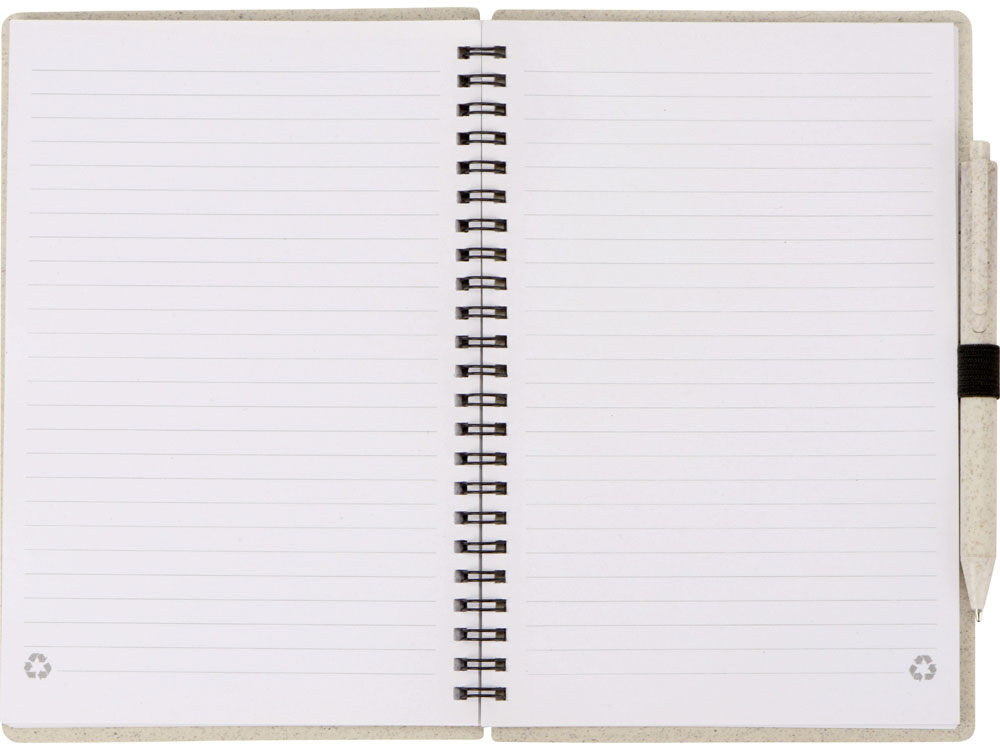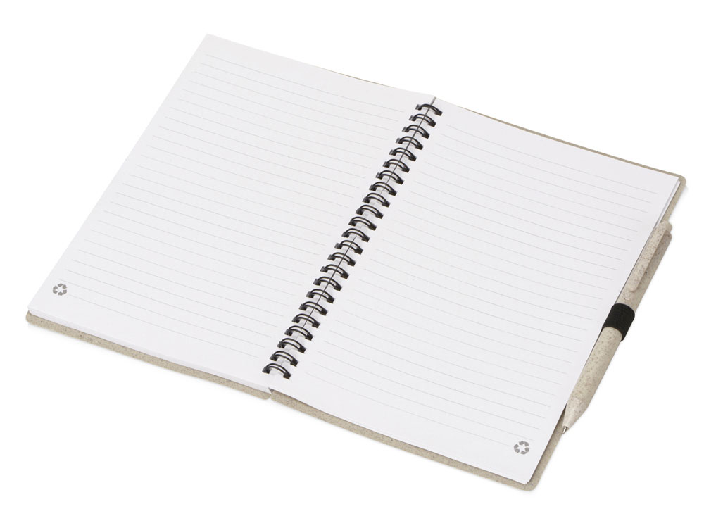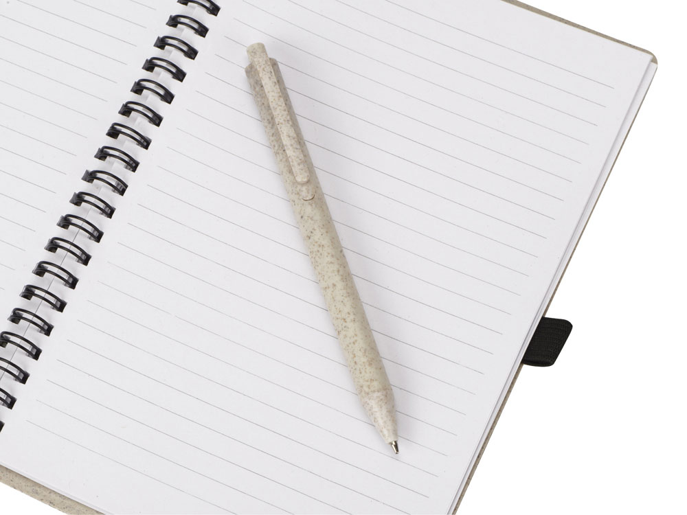 Блокнот с обложкой из переработанной пшеницы и пластика. Блок состоит из 80 листов переработанной бумаги белого цвета. Крепление – пружина. В комплекте шариковая ручка в тон блокноту из пшеничной соломы.