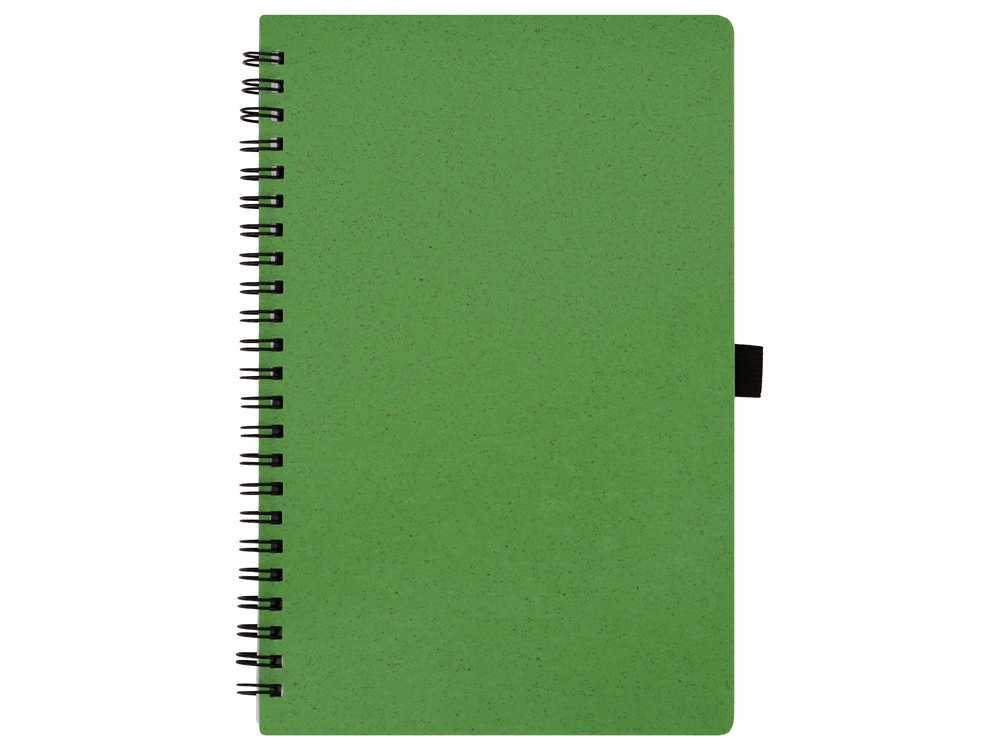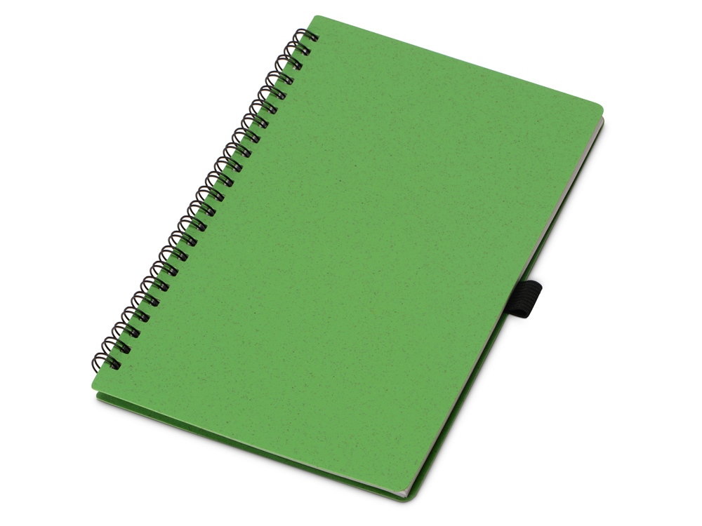 Блокнот с обложкой из переработанной пшеницы и пластика. Блок состоит из 70 листов переработанной бумаги белого цвета. Крепление — пружина. Дополнен петлей для ручки.