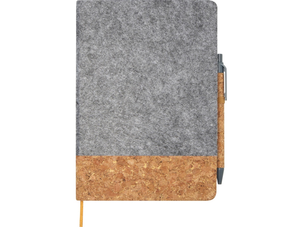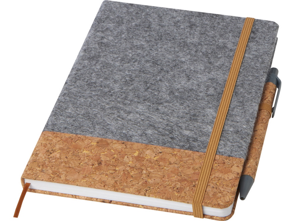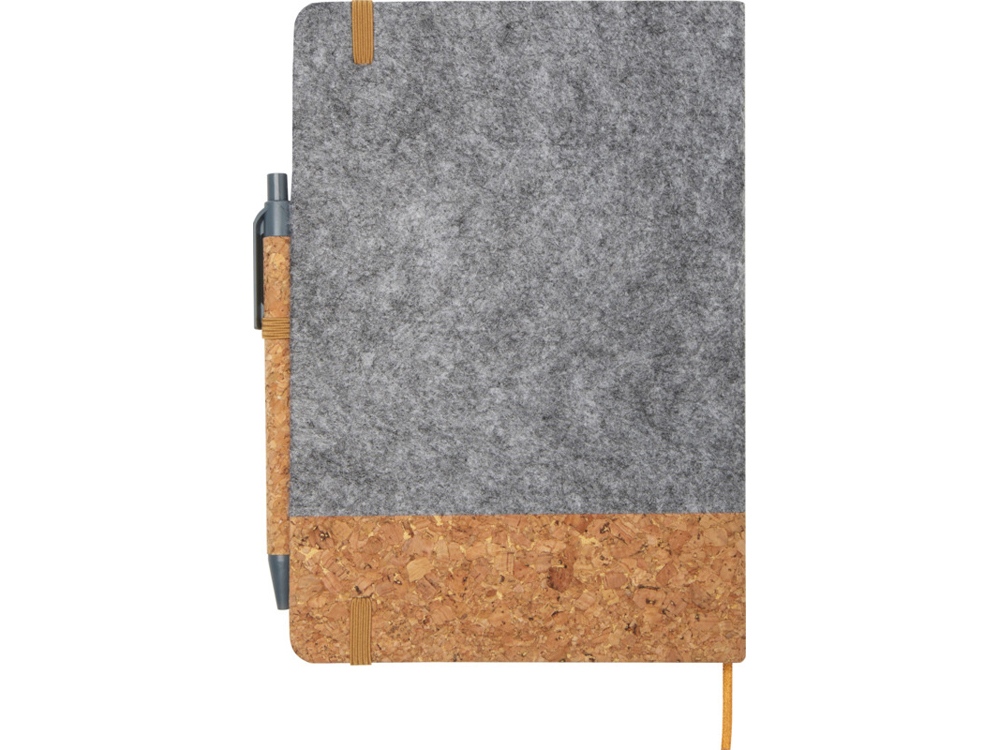 Блокнот формата A5 в твердой обложке изготовлен из пробки и переработанного фетра и состоит из 80 разлинованных листов бумаги плотностью 70 г/м², эластичной застежки, закладки-ленты и петли для ручки. Кнопка, зажим и кончик шариковой ручки изготовлены из переработанного пластика, а корпус — из пробки. Чернила для ручки: черный. Длина непрерывной линии: 600 метров. Размер пера: 1,0 мм. FSC certified paper, Cork, Фетр. FSC Mix Credit P7.1 CU-COC-877277.