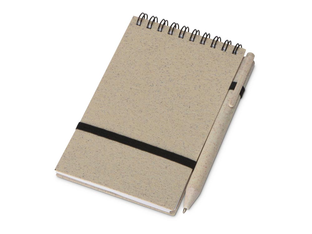 Блокнот с обложкой из переработанной пшеницы и пластика. Блок состоит из 60 листов переработанной бумаги белого цвета. Крепление — пружина. В комплекте шариковая ручка из пшеничной соломы.