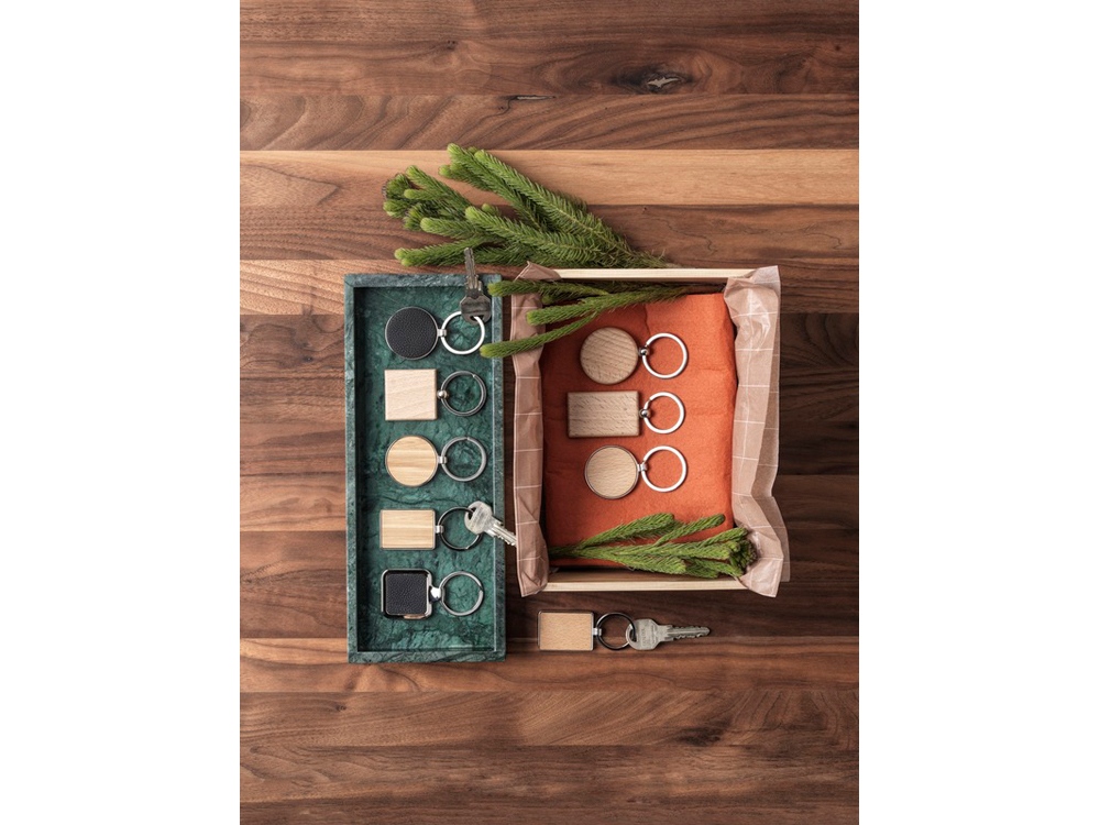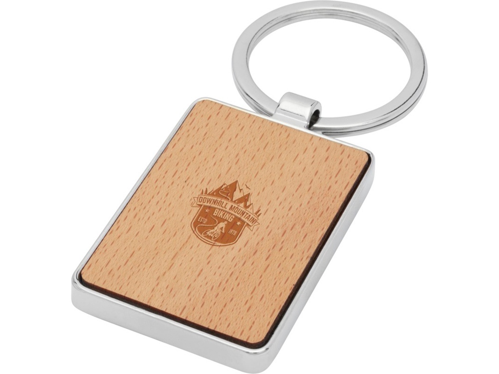 Прямоугольный брелок премиум-качества из буковой древесины с металлическим корпусом из цинкового сплава, поставляемый в коричневой упаковке из шрифтовой бумаги. Размер 4 x 3 см. Пригоден для лазерной гравировки.