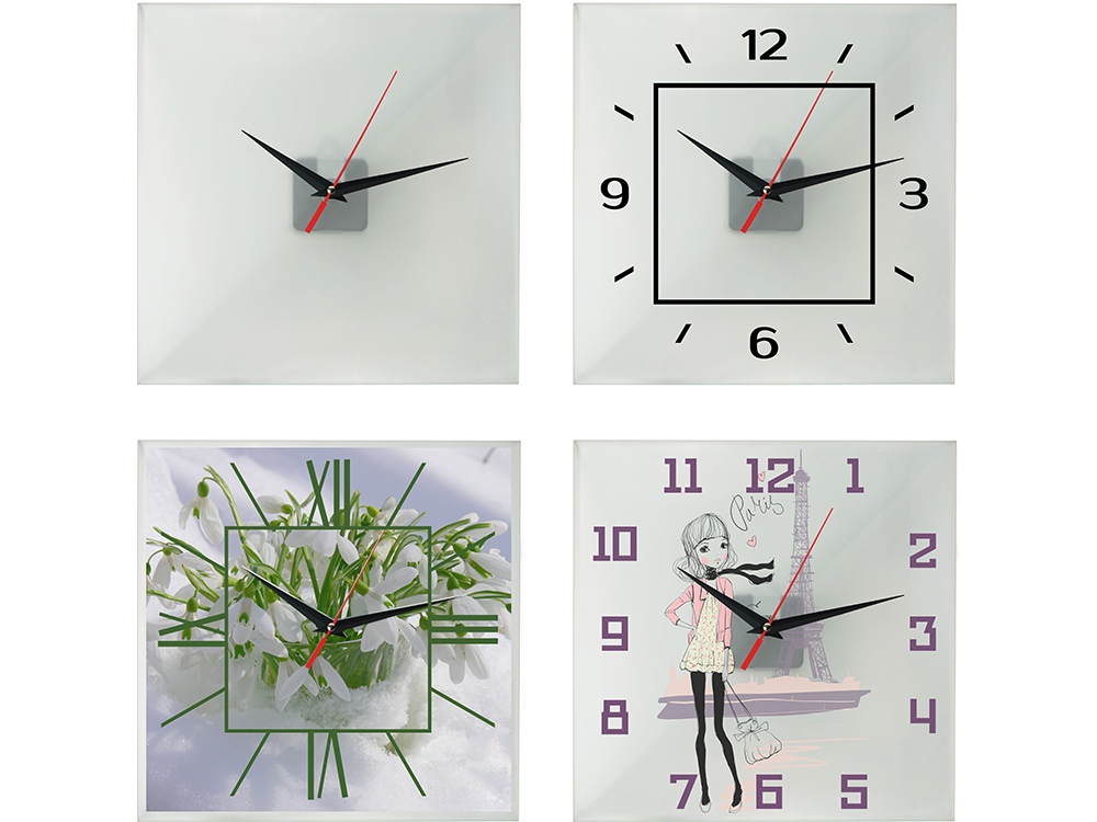 Часы предназначены для нанесения циферблата на стекло по индивидуальному дизайну с помощью технологии цифрового термотрансфера: на оборотную сторону циферблата заводским способом нанесена специальная пленка. Изображение печатают на обычной глянцевой бумаге, а затем закрепляют на циферблате термопрессом — пленка плавится, и бумага с печатью плотно припаивается к стеклу.