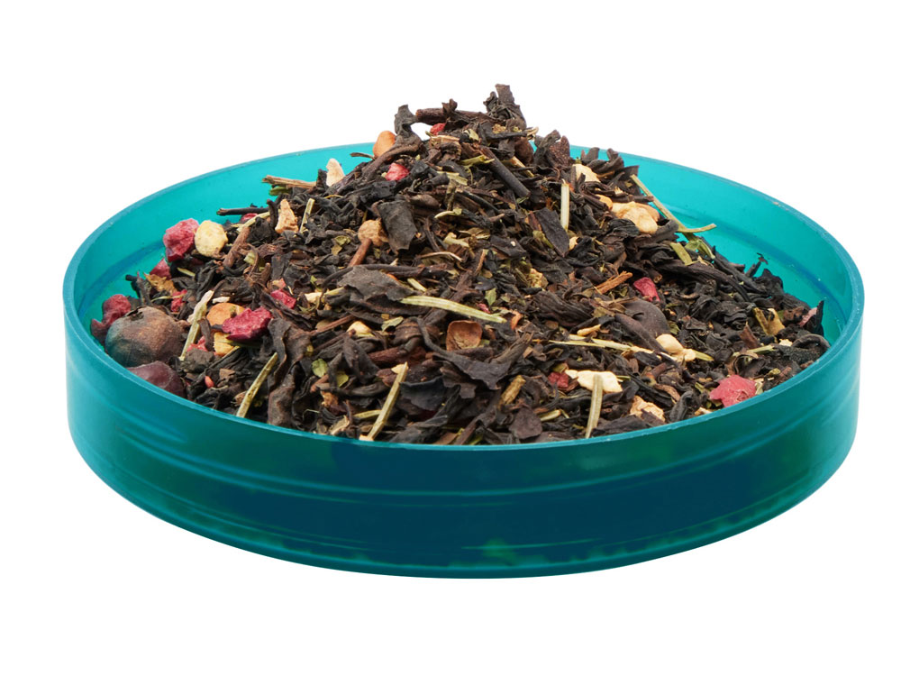 чай черный, ягоды можжевельника, лапки пихты, имбирь, малина, клюква, шиповник, гвоздика, мята