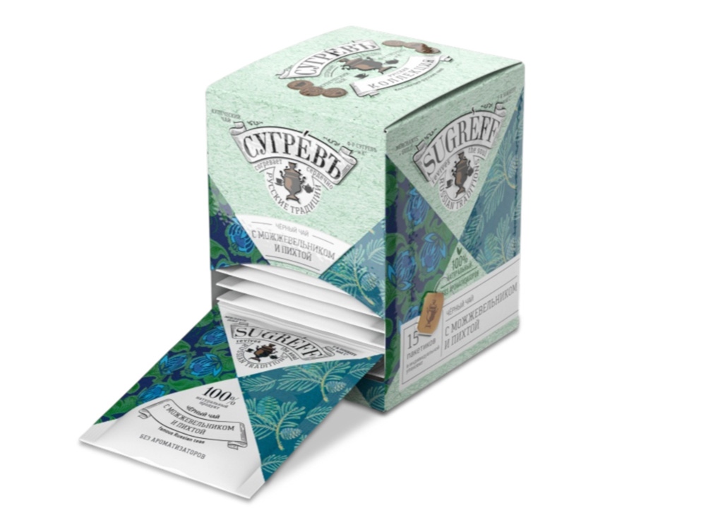 Чай имеет естественно яркий букет, который создаётся эффектным трио из превосходного индийского чая, хвои пихты и ягод можжевельника.