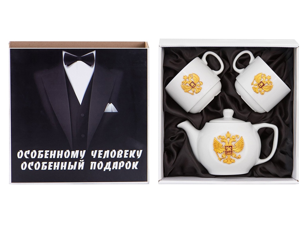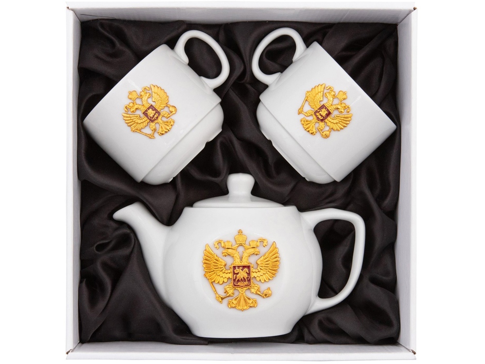 Подарочный набор чайных кружек с фарфоровый чайником Виват, Россия! Фарфоровый чайник и две фарфоровые чайные кружки с чеканным металлическим декором «Двуглавый орел». Накладка изготовлена из алюминия методом чеканки с декоративной отделкой «под золото». Ёмкость чашек 220 мл., ёмкость чайника 400 мл. Ручная работа.