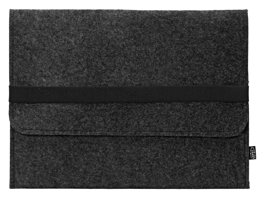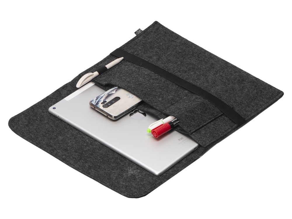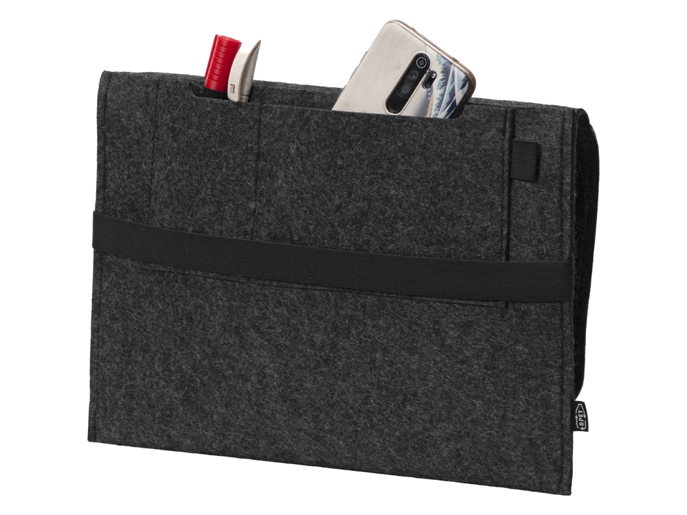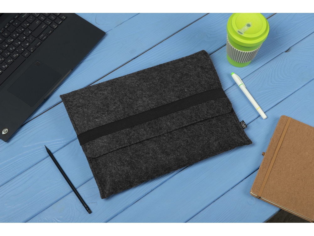 Чехол для ноутбука выполнен из фетра толщиной 3 мм. С передней стороны расположен органайзер размером 13×27 см для канцелярских принадлежностей, карт и телефона. Чехол фиксируется в закрытом виде с помощью эластичной ленты.