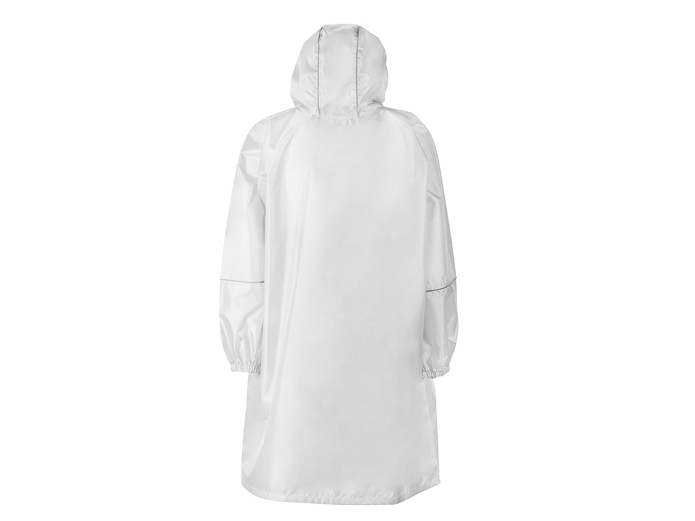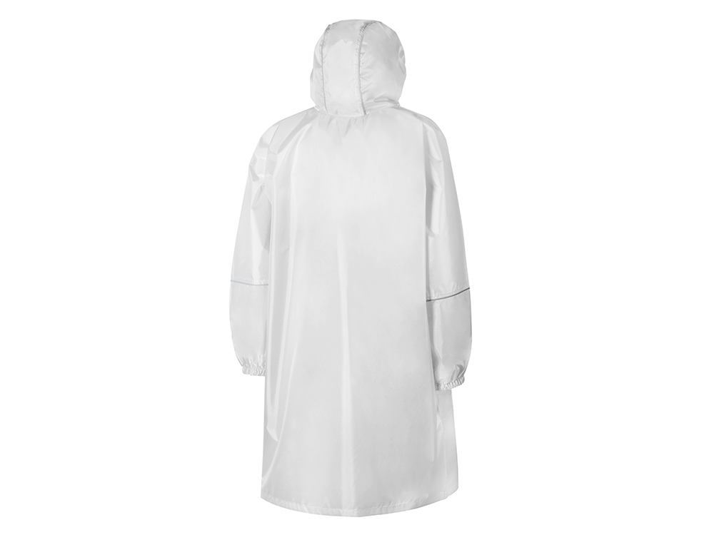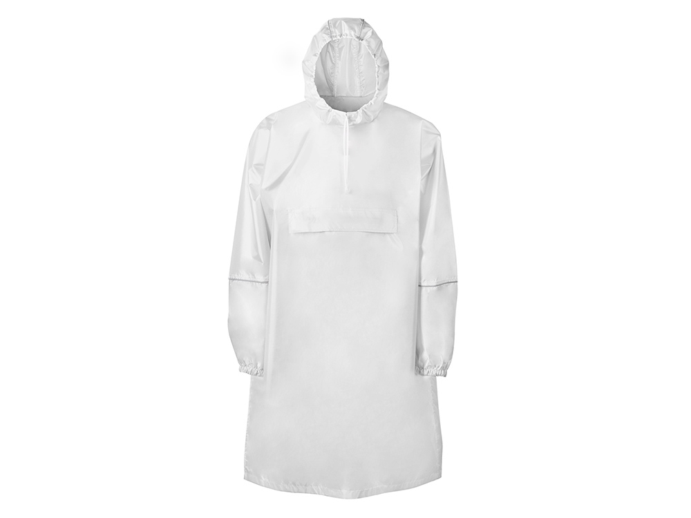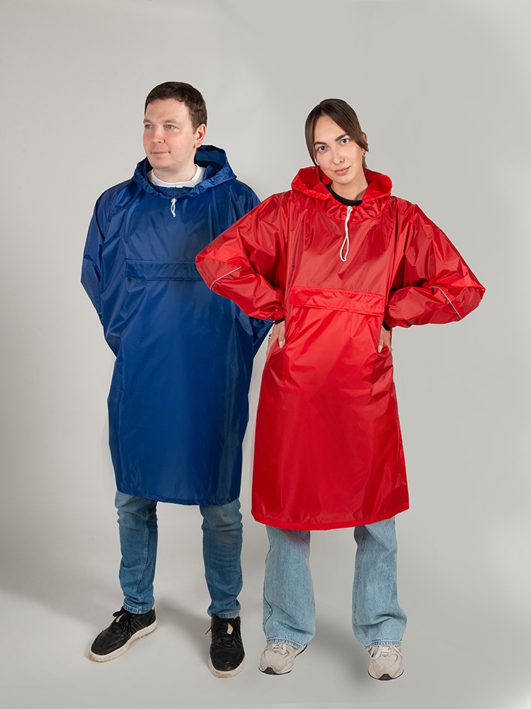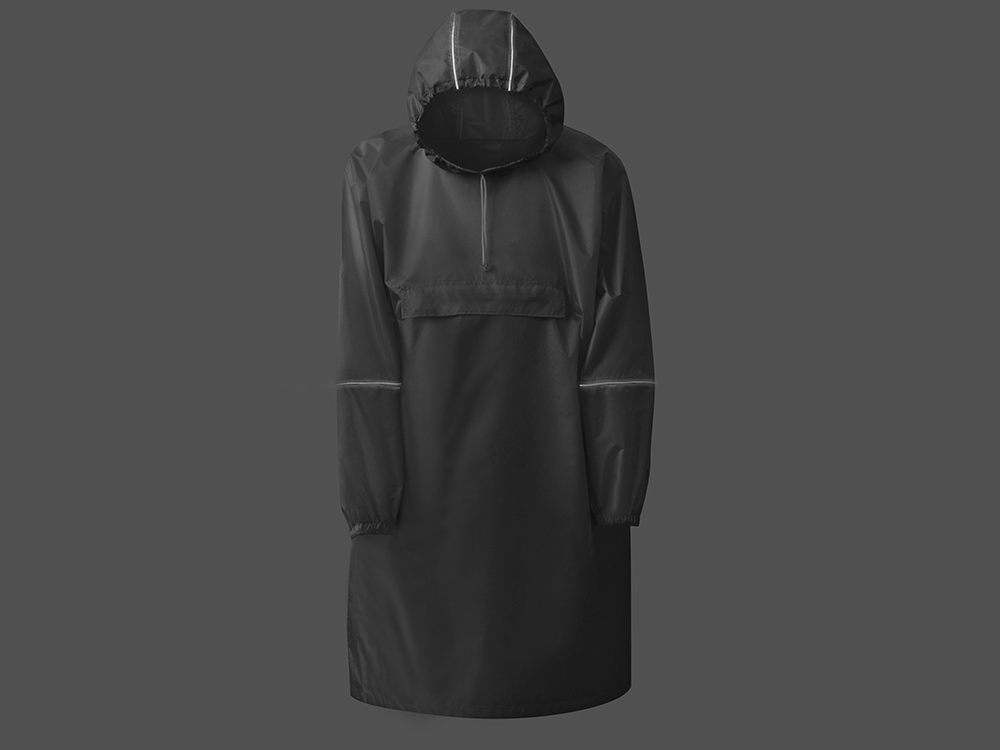 Дождевик – пончо прямого силуэта. Нагрудный карман плаща закрывается на молнию, которая дополнительно защищена клапаном, а еще в него можно полностью убрать дождевик. На дне кармана — ручка-петелька, которая в сложенном виде может использоваться для подвешивания.