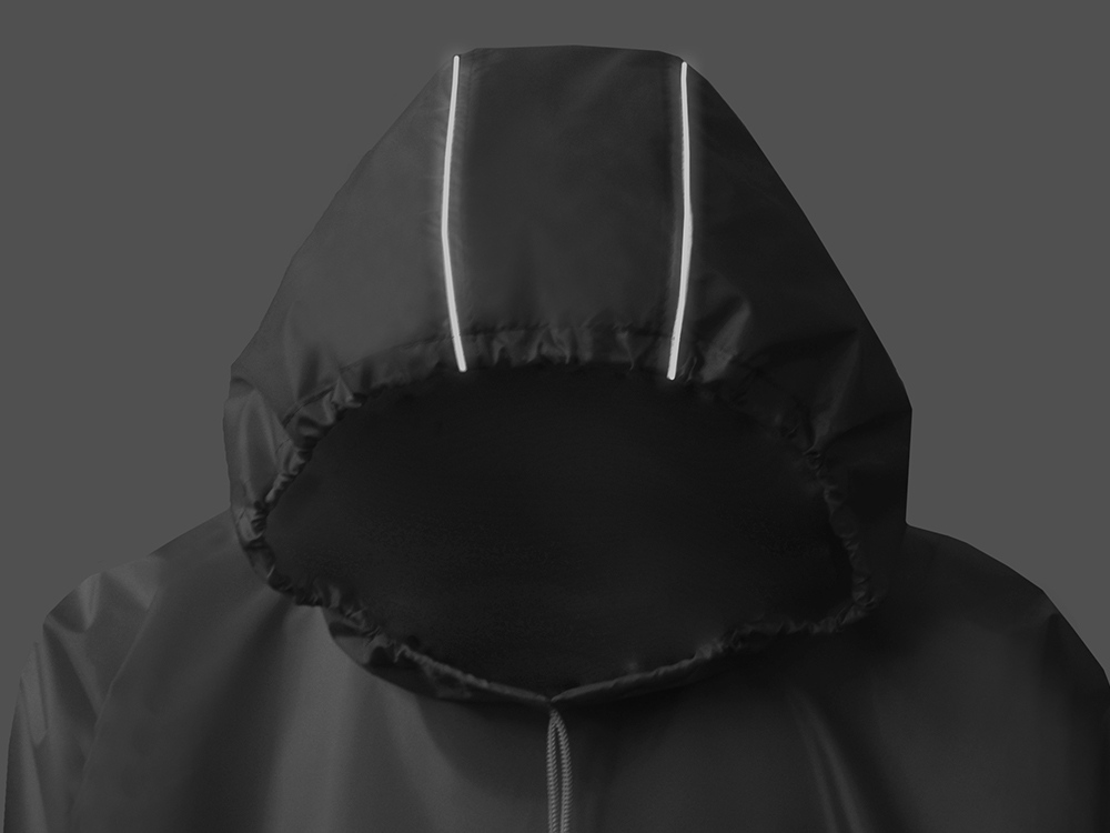 Швы капюшона и рукавов отделаны светоотражающим кантом, который делает человека заметным даже в темное время суток. Для комфортной посадки — затягивающийся на шнурок капюшон с фиксатором и манжеты на резинке.