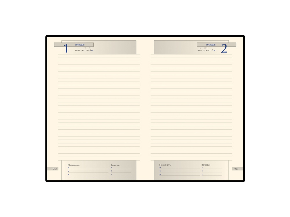 В ежедневнике есть полезная справочная информация и телефонная книга, а также 416 страниц для записи идей, мыслей и составления рабочих планов. Для изготовления страниц используется качественный бежевый офсет повышенной плотности (70 г/кв м), которая производится японской фирмой «Daiwa» и подходит для всех видов чернил.