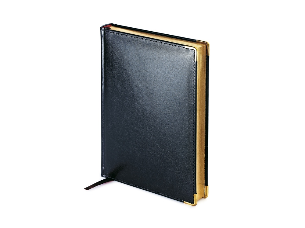 Классический деловой ежедневник линии Imperium в обложке из черной рециклированной кожи – образец элегантности. Гладкую тонкую фактуру кожи подчеркивает декоративная строчка по контуру и металлические закругленные уголки «под золото». Респектабельность и роскошь этого ежедневника усилена за счет металлизированного золотистого обреза и бордовых шелковых ляссе.