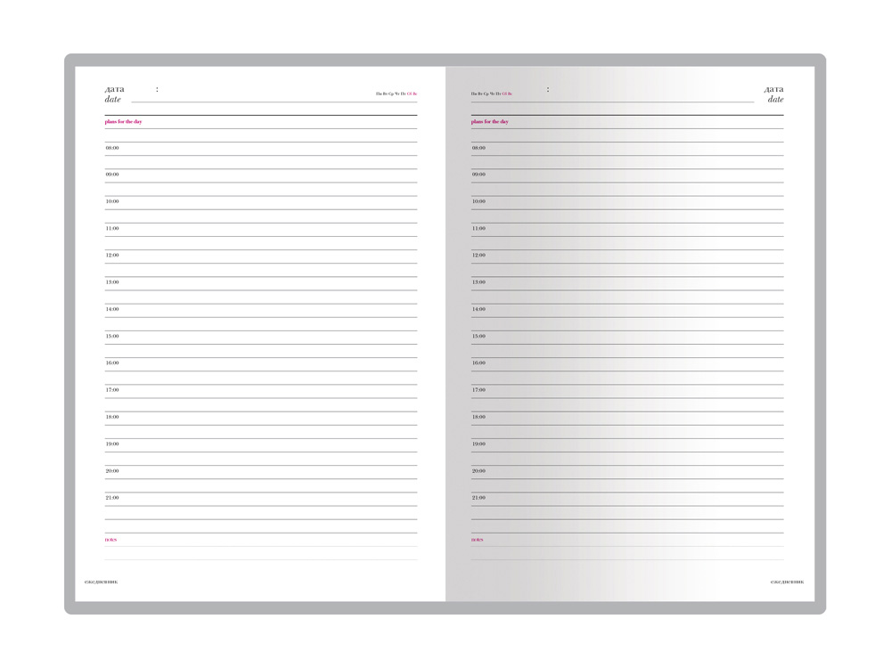 В нем есть полезная справочная информация и телефонная книга, а также 272 страницы для записи идей, мыслей и составления рабочих планов. На каждой странице есть специальное место для написания текущей даты. Приведены сокращенные названия дней недели с понедельника до воскресенья. Для удобства использования этого ежедневника Вам лишь надо подчеркнуть нужный день недели.
