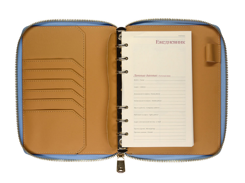 Деловая нежность! Вот как можно охарактеризовать этот очаровательный зефирно-голубой ежедневник. Большое отделение на молнии вмещает в себя и сменный блок для записей на кольцевом механизме, и отделения для визиток и ручки. В этом бизнес-аксессуаре поместятся и дополнительные документы и смартфон.