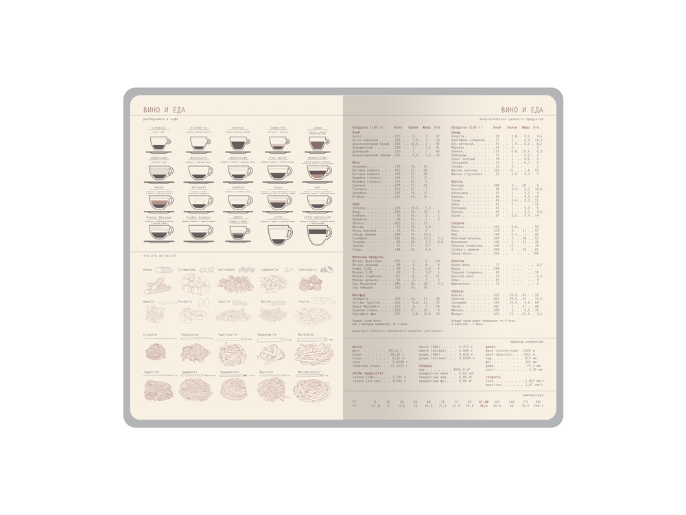 Ежедневник формата А5 имеет внутренний блок из 272 страниц. Блок изготовлен из бежевой бумаги плотностью 70 г/м2 и содержит: