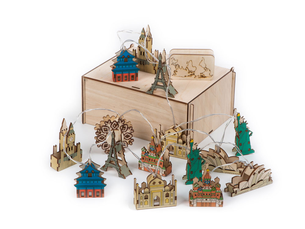 Новогодняя ёлочная гирлянда постоянного свечения с цветными фигурками достопримечательностей из натуральной березовой фанеры сделает процесс украшения ёлки или дома не только увлекательным, но и познавательным!