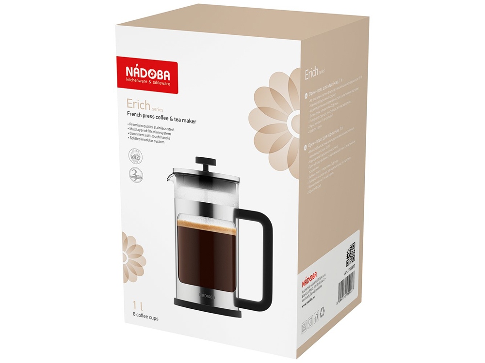 Френч-прессы серии Erich имеют колбу, выполненную из жаропрочного боросиликатного стекла. Прочный подстаканник из нержавеющей стали с пластиковой подставкой обеспечивает дополнительную термоизоляцию и предохраняет колбу от повреждений. Многослойная система фильтрации френч-прессов выполнена из высококачественной нержавеющей стали 18/10. Удобная ручка с покрытием «Софт-тач» не нагревается и не выскальзывает из рук. Разборная конструкция изделий и системы фильтрации облегчают легкий и качественный уход. В комплекте предусмотрена мерная ложка 7г для точной дозировки продуктов. В серию входят френч-прессы объёмом 1, 0,6 и 0,35 л. Гарантия на френч-прессы серии Erich 3 года.