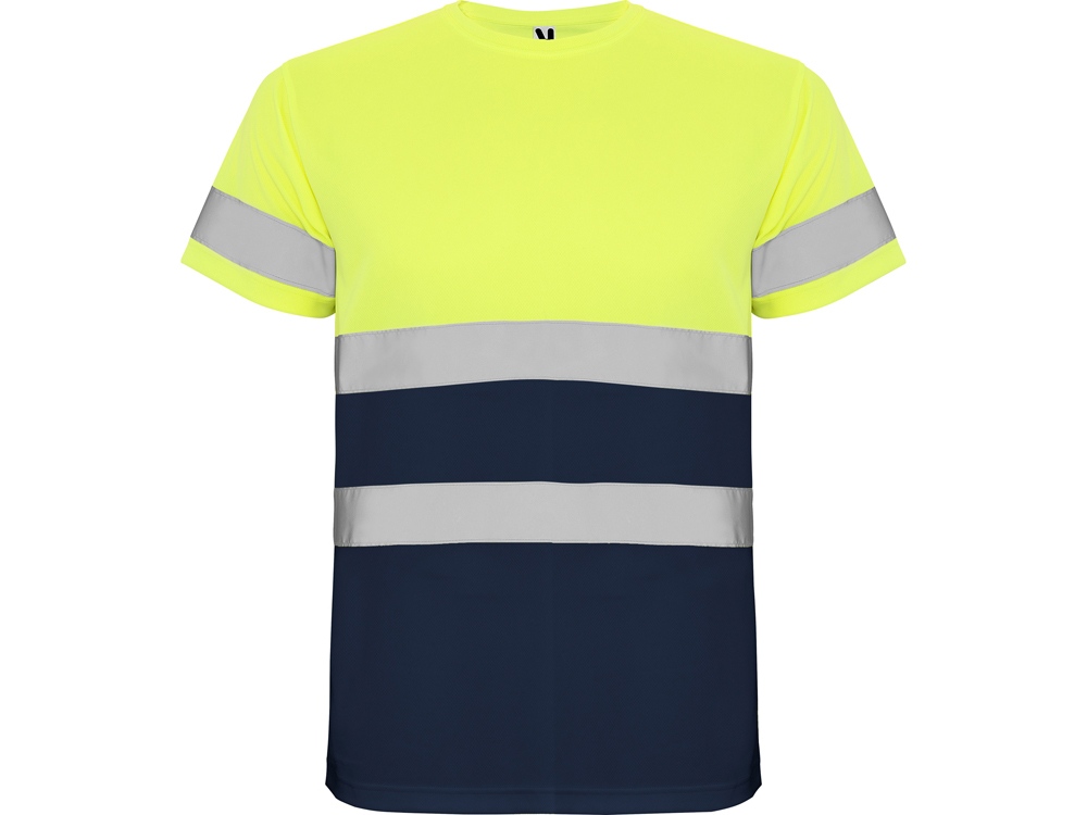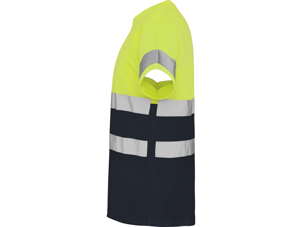 Футболка со светоотражающими элементами с короткими рукавами. Круглая горловина из той же ткани, с усиленными закрытыми швами на внутренней стороне горловины. Две горизонтальные светоотражающие полосы на туловище и одна светоотражающая полоса на рукавах.
