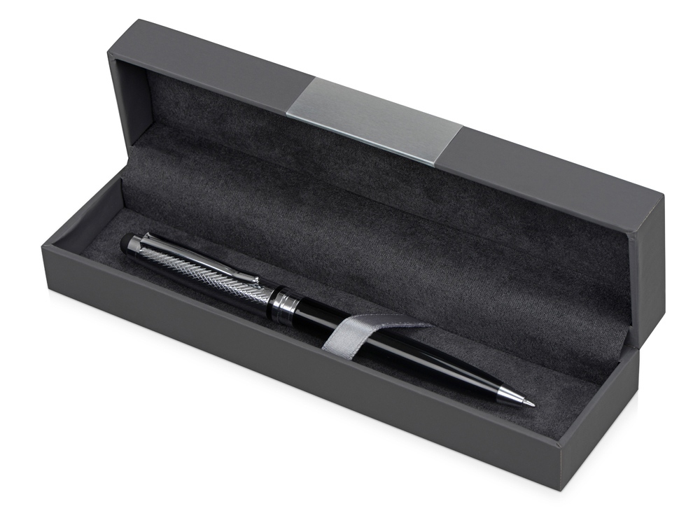 Футляр для ручки изготовлен из прочного картона с матовым покрытием, имитирующим кожу. Декоративная серебристая вставка придаёт футляру премиальный вид. Внутренняя часть отделана велюром, на котором ручка фиксируется при помощи атласной ленты.