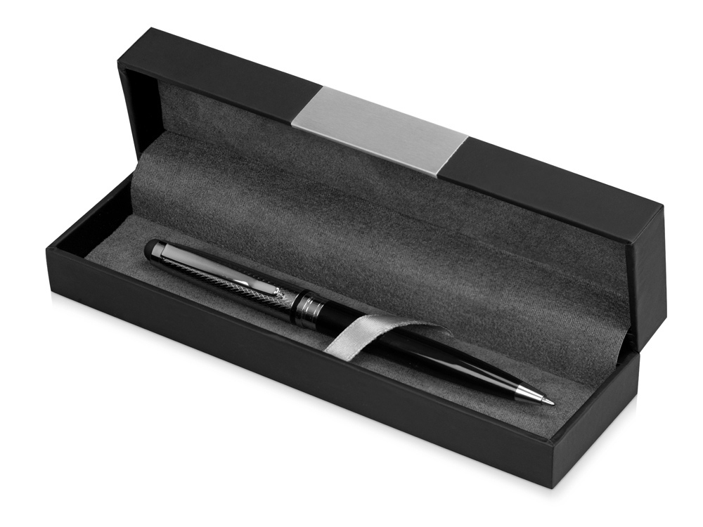 Футляр для ручки изготовлен из прочного картона с матовым покрытием, имитирующим кожу. Декоративная серебристая вставка придаёт футляру премиальный вид. Внутренняя часть отделана велюром, на котором ручка фиксируется при помощи атласной ленты.