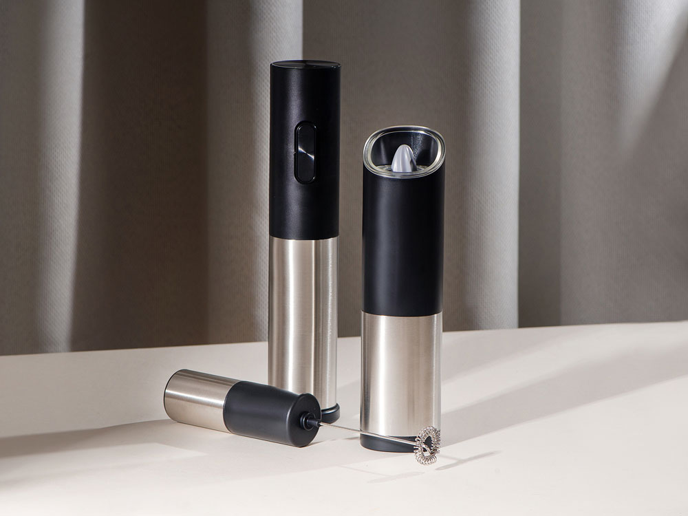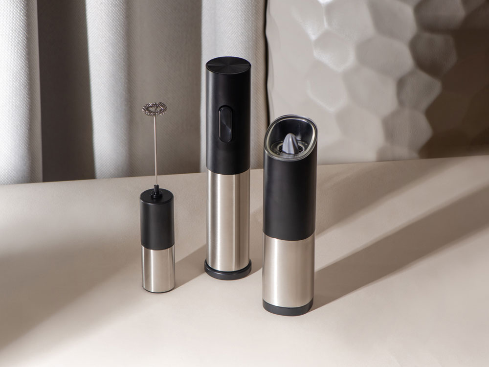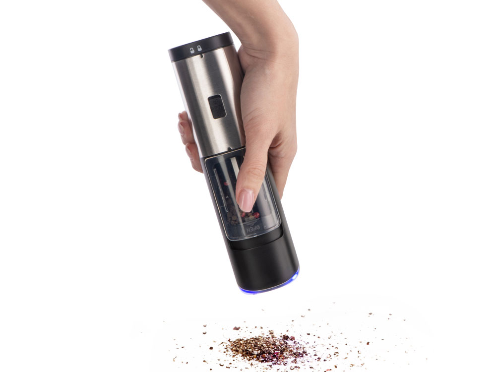 Мельница включается лишь в перевернутом положении, что позволяет снизить расход батареек и решает проблему случайного срабатывания устройства. Эргономичный корпус выполнен из нержавеющей стали и текстурного АБС-пластика.