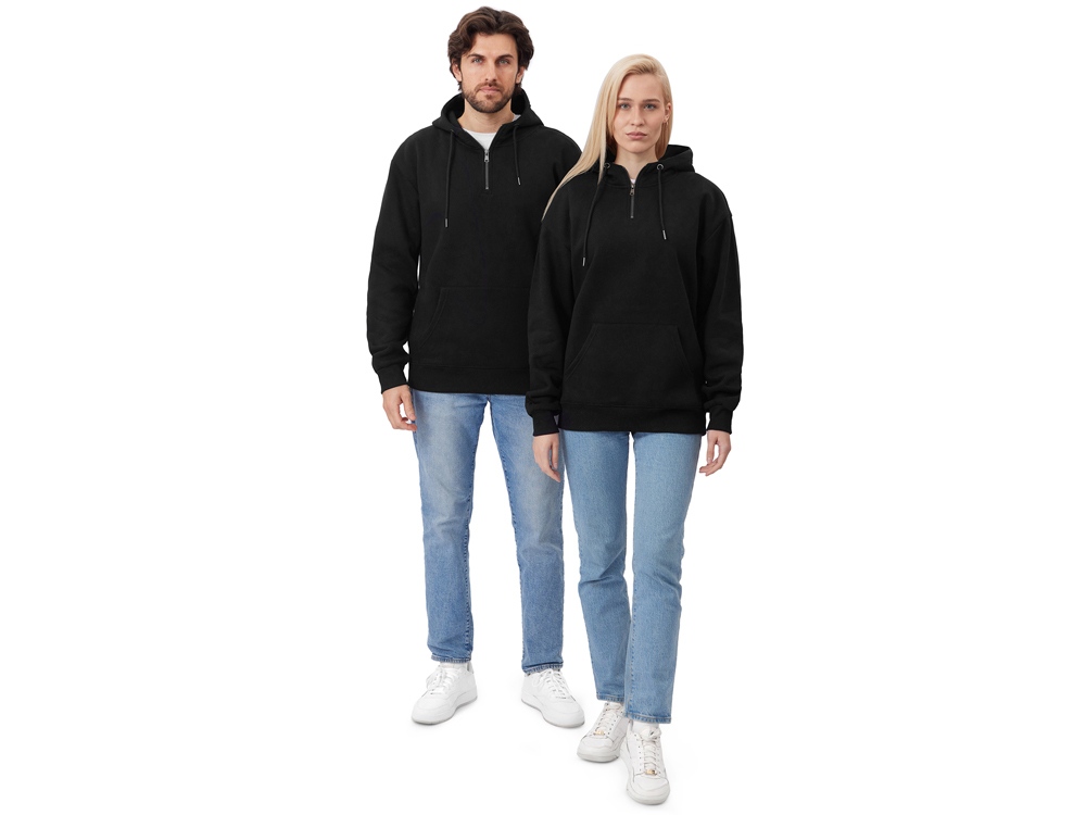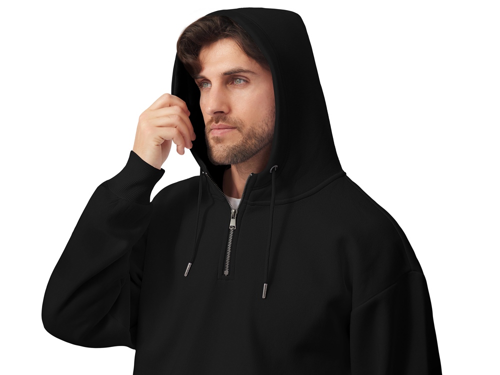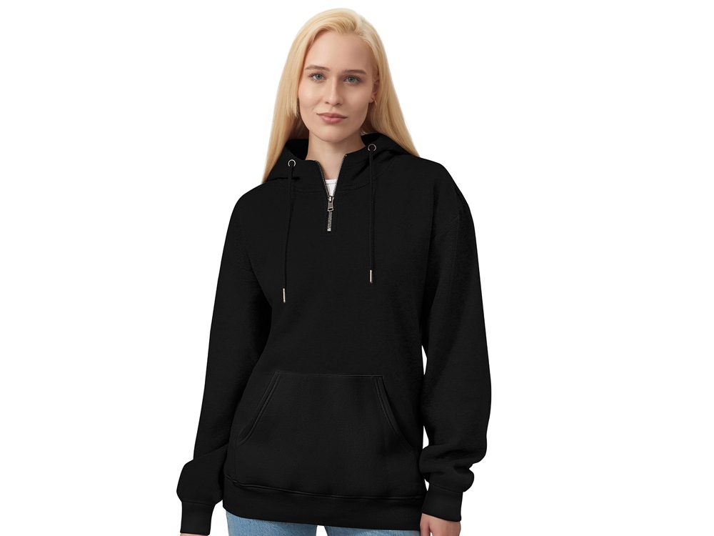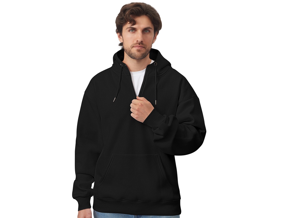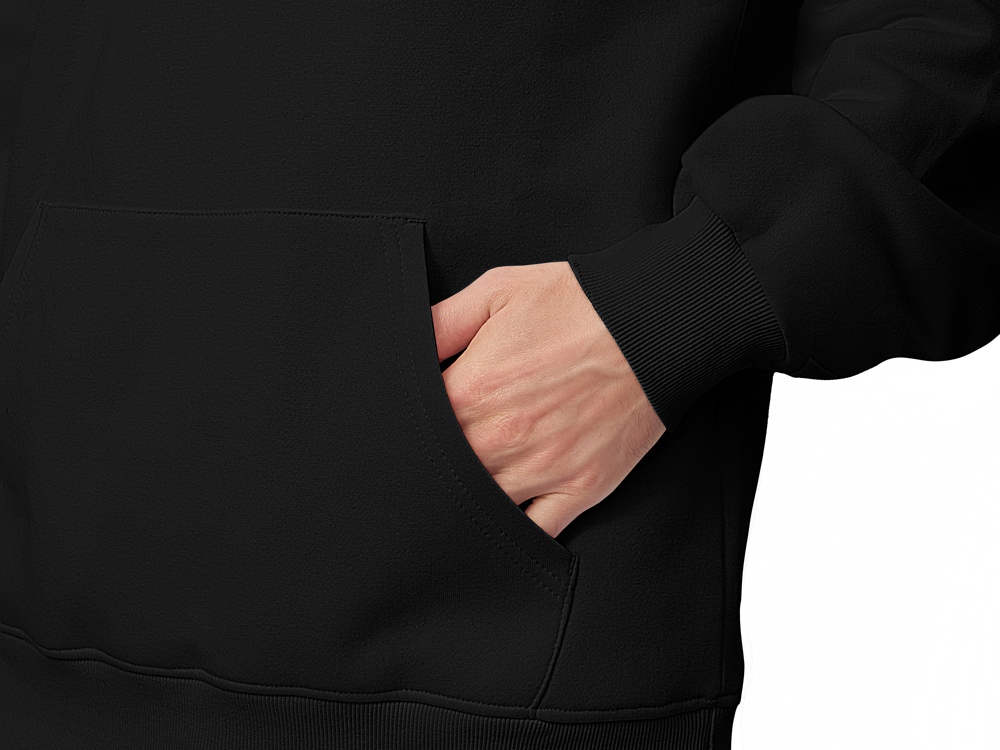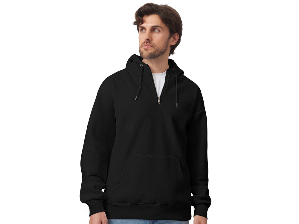 Худи с капюшоном ворот на молнии. Шнур в капюшоне с металлическими наконечниками. Отделка горловины спинки внутри тесьмой, Риб 2х2 по низу изделия и манжетам. Удобный карман кенгуру.