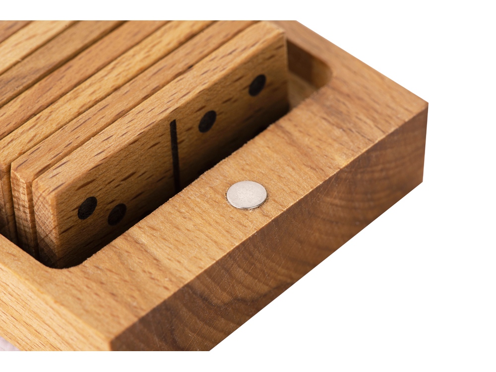 Крышка футляра оснащена магнитным замком, что обеспечивает удобство переноски и хранения домино — костяшки точно не потеряются.