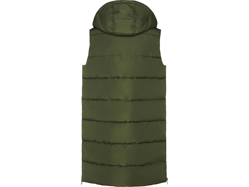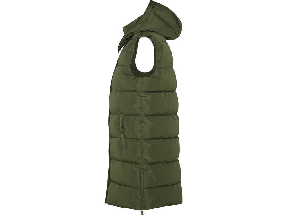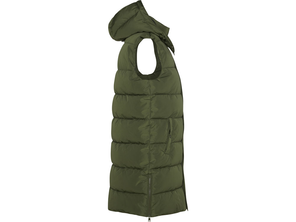 Женский стеганый жилет со съемным капюшоном. · Высокий воротник. · Передняя застежка на молнию и кнопки. · Два кармана на кнопках. · Боковые разрезы продублированы молниями. · Внутренний доступ для нанесения