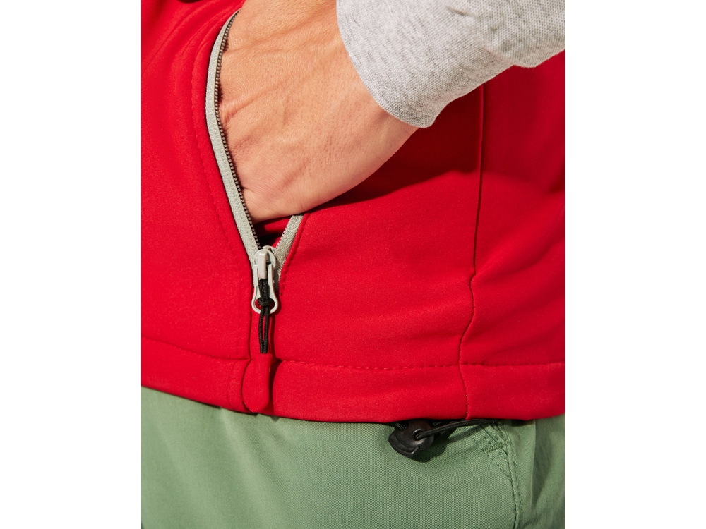 Жилет из 2-х слойного софтшелл материала. — Контрастная водоотталкивающая молния с защитой для подбородка. — Три внешних кармана на молнии с бегунком в тон. — Низ с эластичным шнуром и регуляторами.