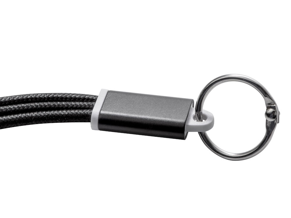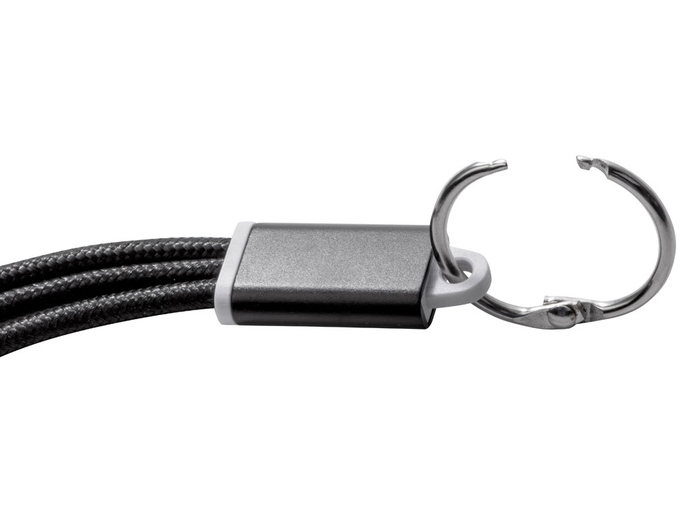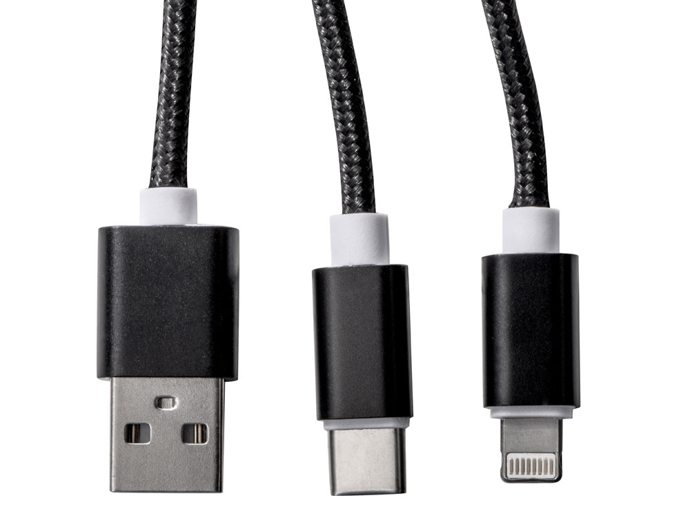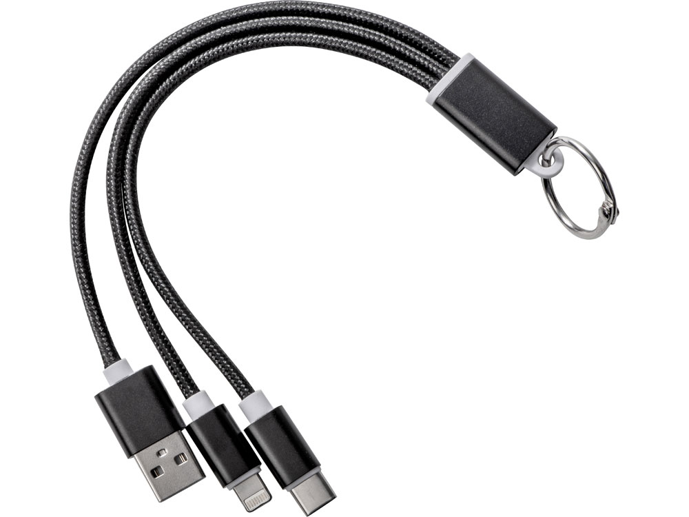 Кабель для зарядки «Tres» 3-в-1 с брелоком, коннекторами 1 type с, 1 USB type A и двойным совместимым коннектором «2-в-1» для устройств с ОС Apple® iOS и Android. В комплект входит брелок. Для зарядки устройств Apple подключайте кабель стороной без контактов; для зарядки устройств с ОС Android подключайте кабель стороной с контактами. Алюминий.