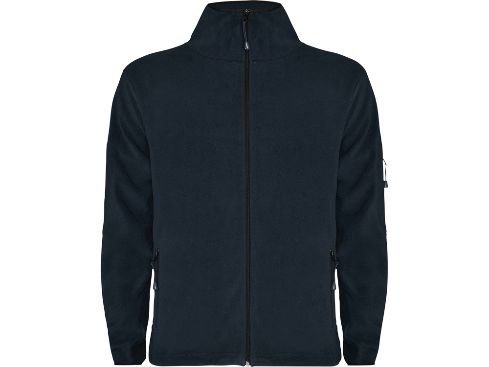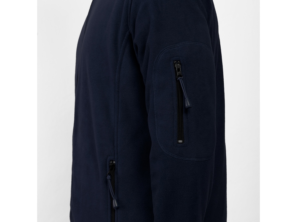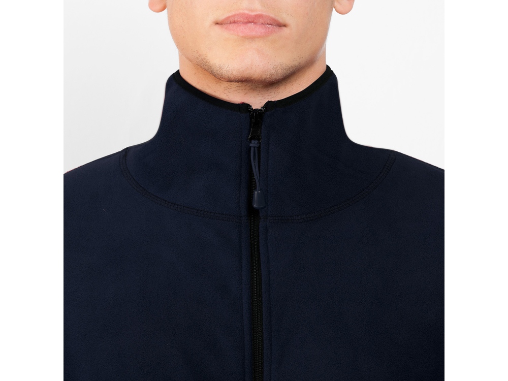 Куртка из микрофлиса с высоким воротом. Контрастная центральная молния, боковые карманы на молнии, декоративная молния на левом рукаве, отделка резинкой по краю рукавов. Налокотники из основного материала.