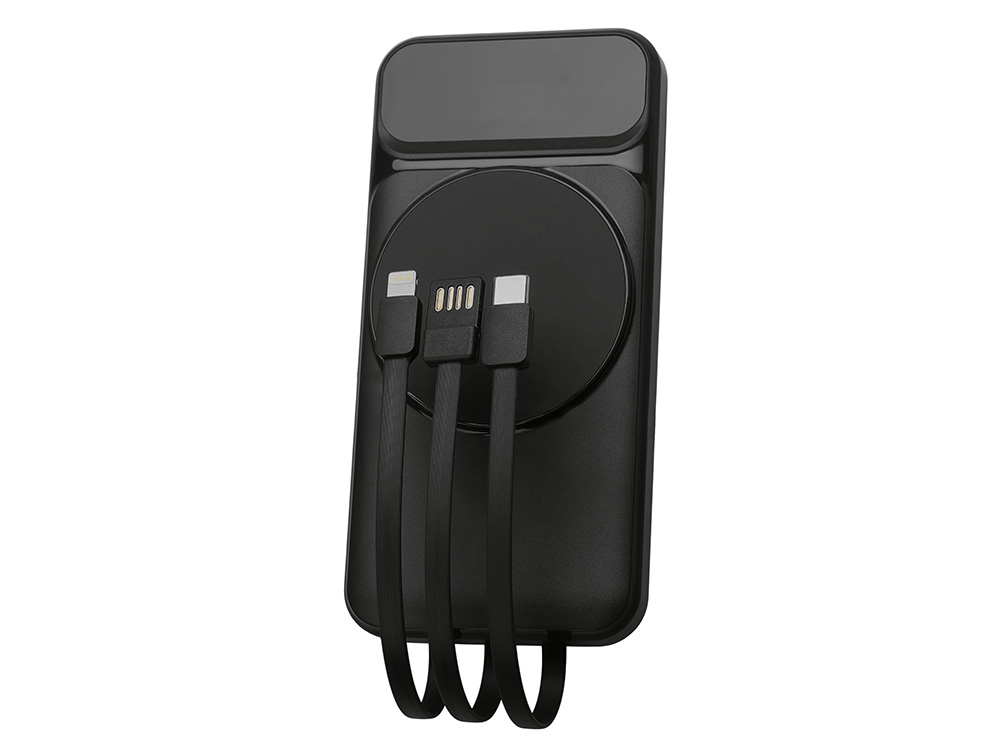 Функциональный и удобный внешний аккумулятор на 10 000 мАч обеспечивает быструю зарядку как по кабелям, так и беспроводным способом, поддерживая современные стандарты скорости. Цифровой дисплей на верхней панели мгновенно показывает точный уровень заряда, а встроенные кабели Lightning, USB-C и входной USB-A устраняют необходимость в дополнительных проводах — всё, что нужно для каждодневного использования, уже есть в самом гаджете. Компактные габариты, сопоставимые с размером смартфона, делают устройство идеальным для путешествий и повседневного использования. Сильные магниты гарантируют надёжное крепление при беспроводной зарядке. В комплекте есть силиконовая накладка: перед использованием удалите защитный стикер и прикрепите её к корпусу.
