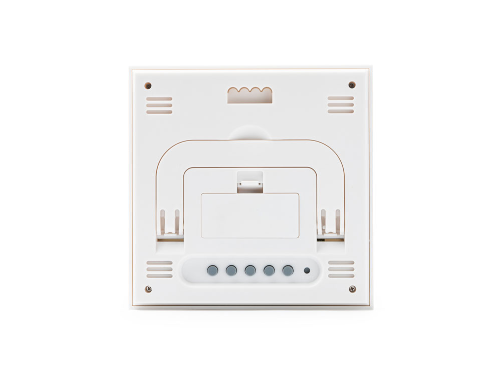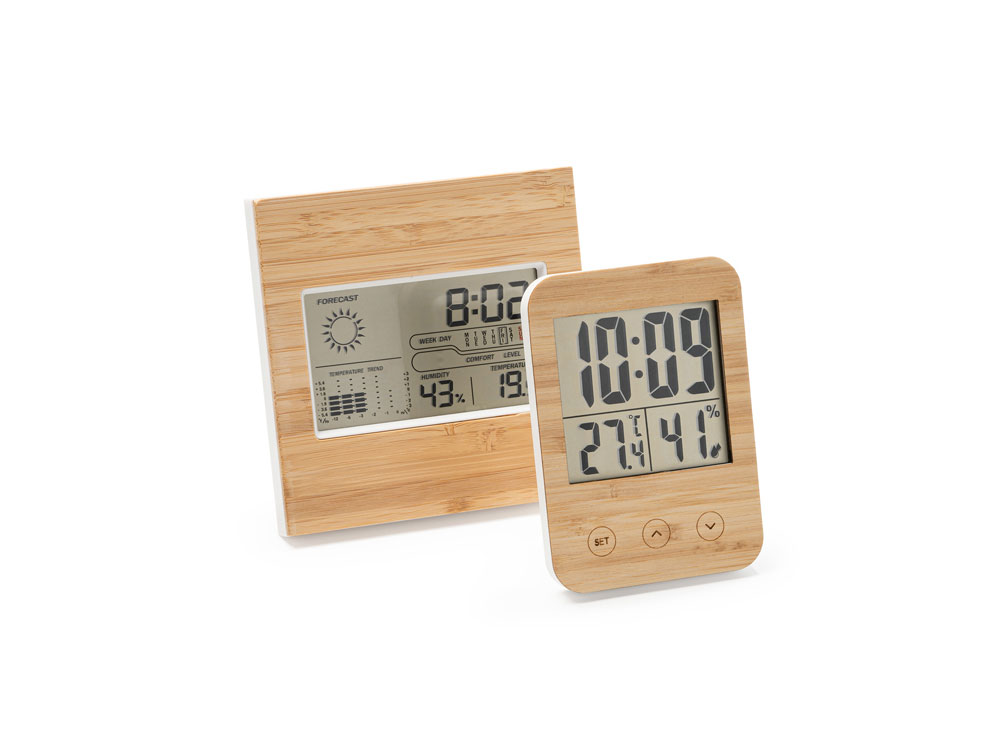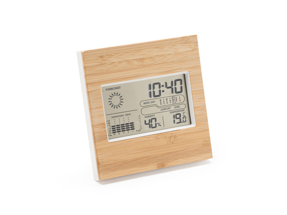 Метеостанция с лицевой стороной из бамбука. Часы, календарь и функция будильника с датчиками температуры и влажности. Запись максимальной и минимальной температуры и влажности. Работает от 2 батареек типа ААА (не входят в комплект).