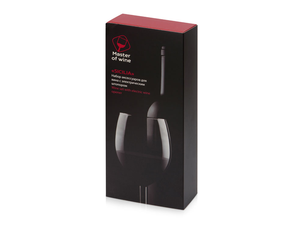 Набор «Sicilia» от Master of Wine состоит из электрического штопора из нержавеющей стали, пробки для вина, аэратора и ножа для фольги — с ним вы сможете откупорить вино и подготовить его к употреблению наилучшим образом.