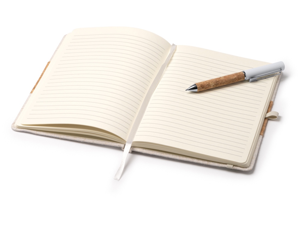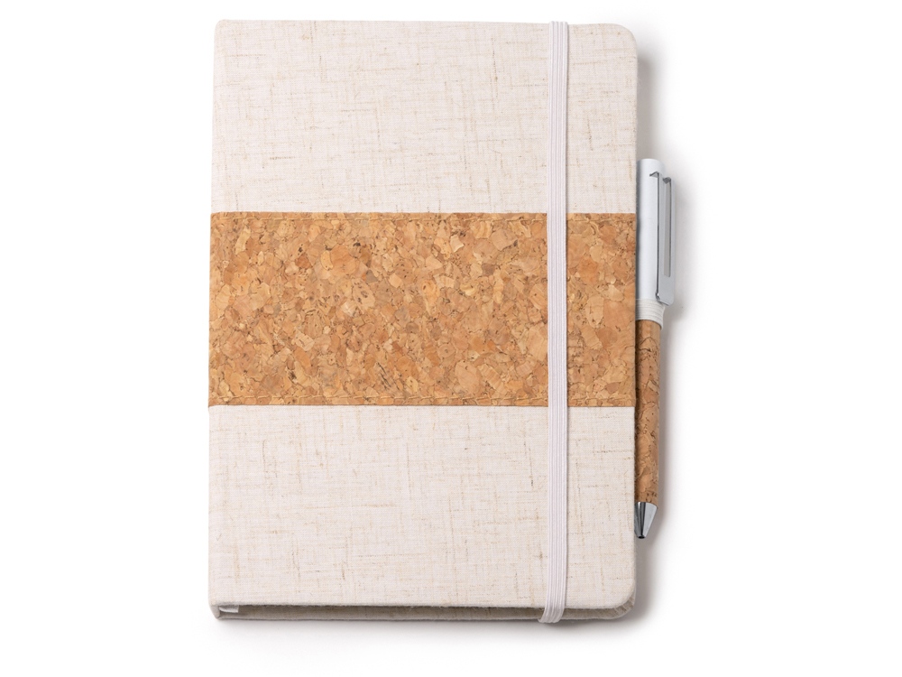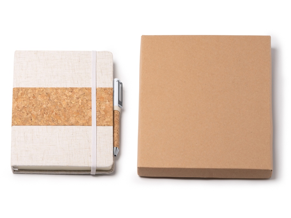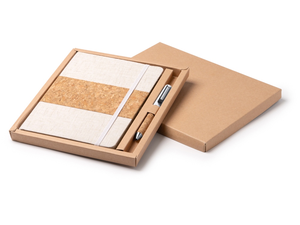 Набор состоит из блокнота A5 и ручки в коробке из крафта. Блокнот в твердой обложке из хлопка и пробки с 80 линованными листами. Металлическая шариковая ручка в корпусе из пробки и с синими чернилами.