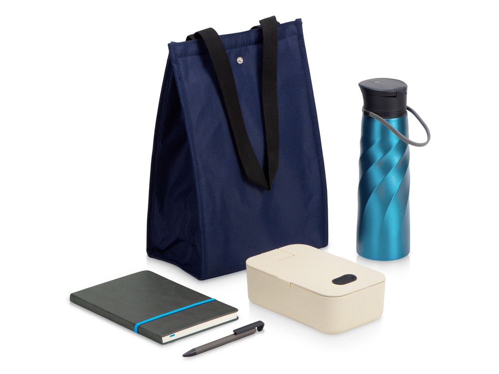 бутылка- нержавеющая cталь; ланчбокс- 50% пшеничное волокно, 50% ПП пластик; блокнот- Термо PU с зернистой структурой; ручка- металл/пластик; сумка- полиэстер