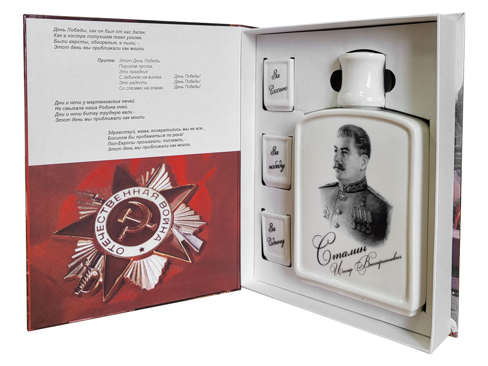 Подарочный набор стилизован под книгу и состоит из штофа с изображением генералиссимуса И. В. Сталина и трех рюмок с патриотическими тостами “За Россию”, “За Родину”, “За победу”. Все сувениры выполнены из высококачественной керамики, поэтому они еще долго будут служить и радовать глаз. Этот подарочный набор станет прекрасным дополнением к праздничному столу.