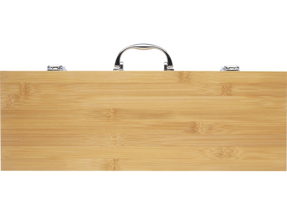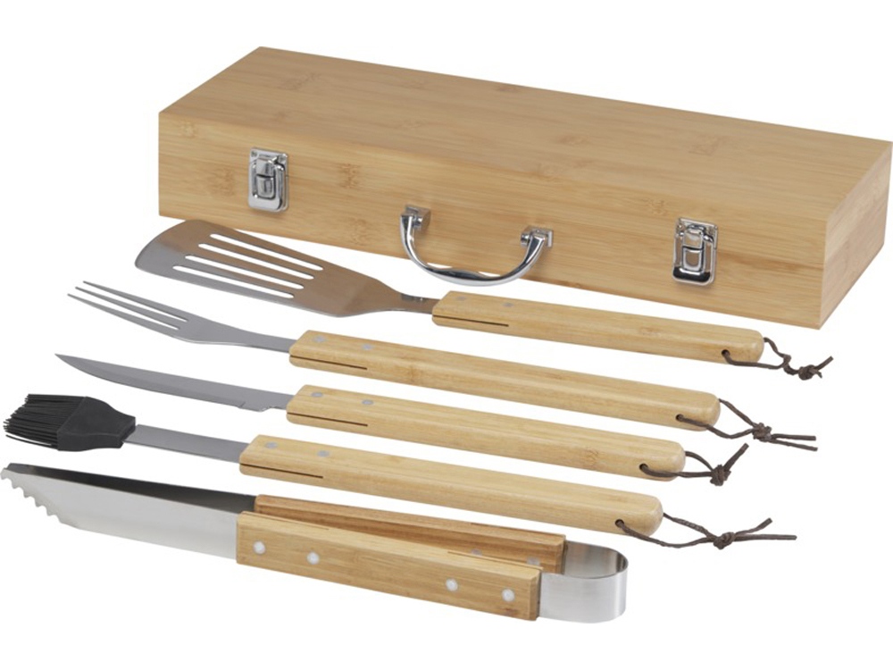 Набор для барбекю из 5 предметов из бамбука: лопатка (40 x 9,5 см), щипцы (34,5 x 6 см), вилка (38,5 x 3 см), нож (38,5 x 3 см) и щетка (38 x 4,3 см). Набор поставляется в подарочной коробке из бамбука (46 x 16,2 x 7,4 см). Ручки и подарочная коробка изготовлены из бамбука, который производится в соответствии со стандартами устойчивого развития.