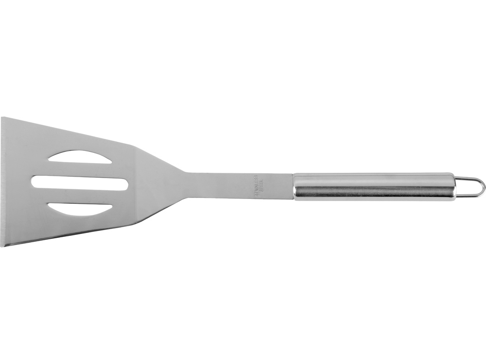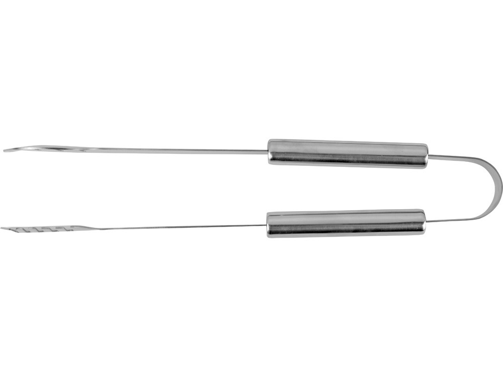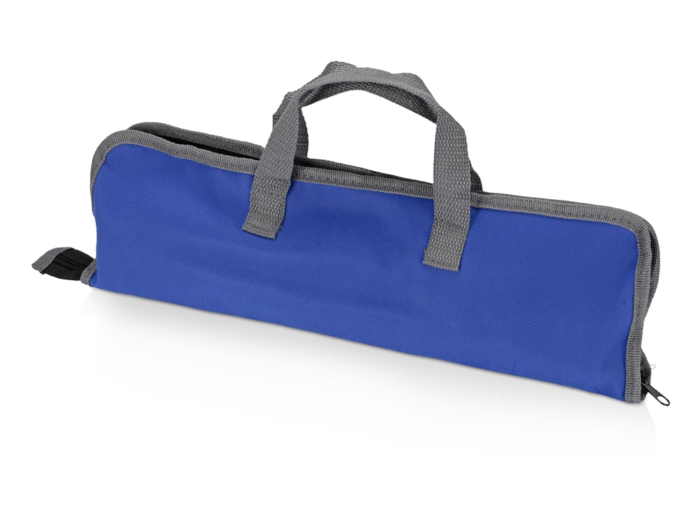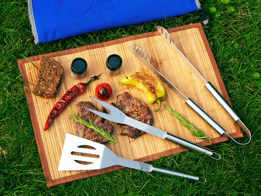 Набор включает в себя вилку, лопатку, щипцы, солонку и перечницу. Удобный чехол на замке-молнии позволяет компактно хранить составляющие набора. На чехол можно нанести изображение или надпись.