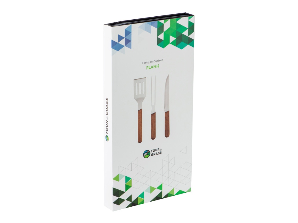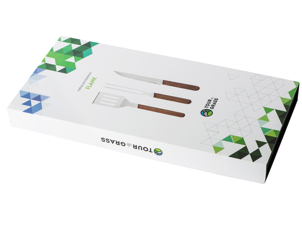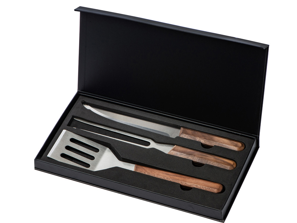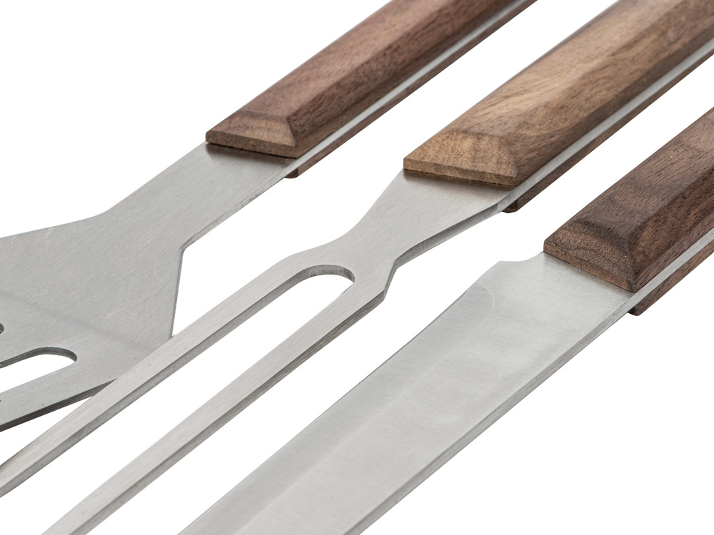 Набор для барбекю от Tour de Grass состоит из лопатки, вилки и ножа с ореховыми ручками. Все три приспособления для готовки — изящные, функциональные, прекрасно подойдут для подарка, а футляр на магните, идущий в комплекте, решит вопрос упаковки.