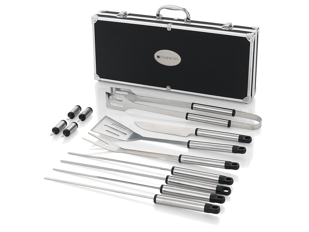 Набор для барбекю 12 предметов. 4 шампура, 4 шпажки для снятия шашлыка, нож, щипцы, вилка, лопатка. Шильд в комплекте 4,8 х 8,3 см. Внимание, на изделии возможны царапины, замятия, пятна, повреждение коробок. В связи с этим цена на товар снижена, претензии, связанные с наличием указанных дефектов, не принимаются.
