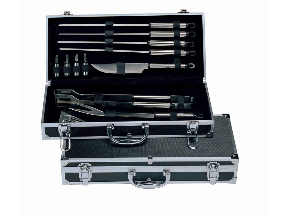 4 шампура, 4 шпажки для снятия шашлыка, нож, щипцы, вилка и лопатка