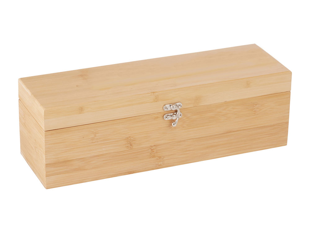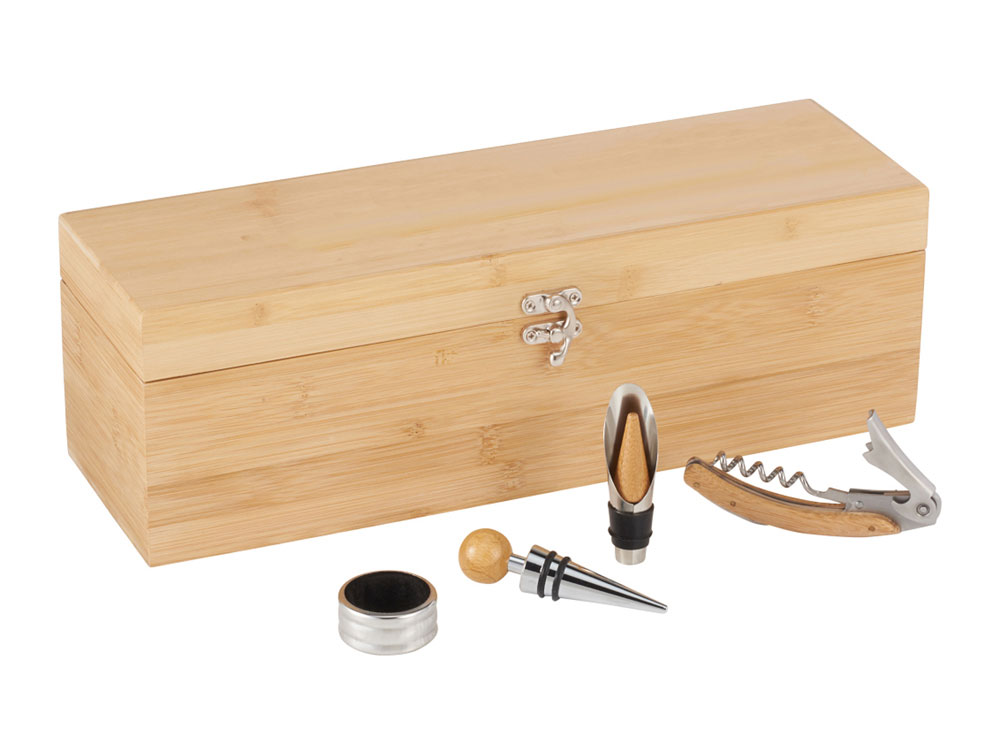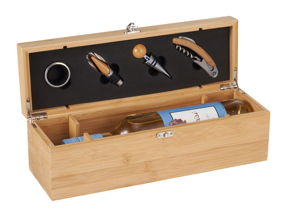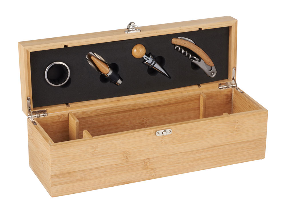 Набор Anniversary представляет собой прямоугольный бамбуковый футляр для бутылки вина, дополненный кольцом-каплеуловителем, пробкой, воронкой и штопором, которые украшены бамбуковыми вставками. Аксессуары располагаются в специальных гнездах, расположенных на крышке, благодаря чему их очень удобно хранить. Из-за особенностей бамбукового материала качество лазерной печати может отличаться.