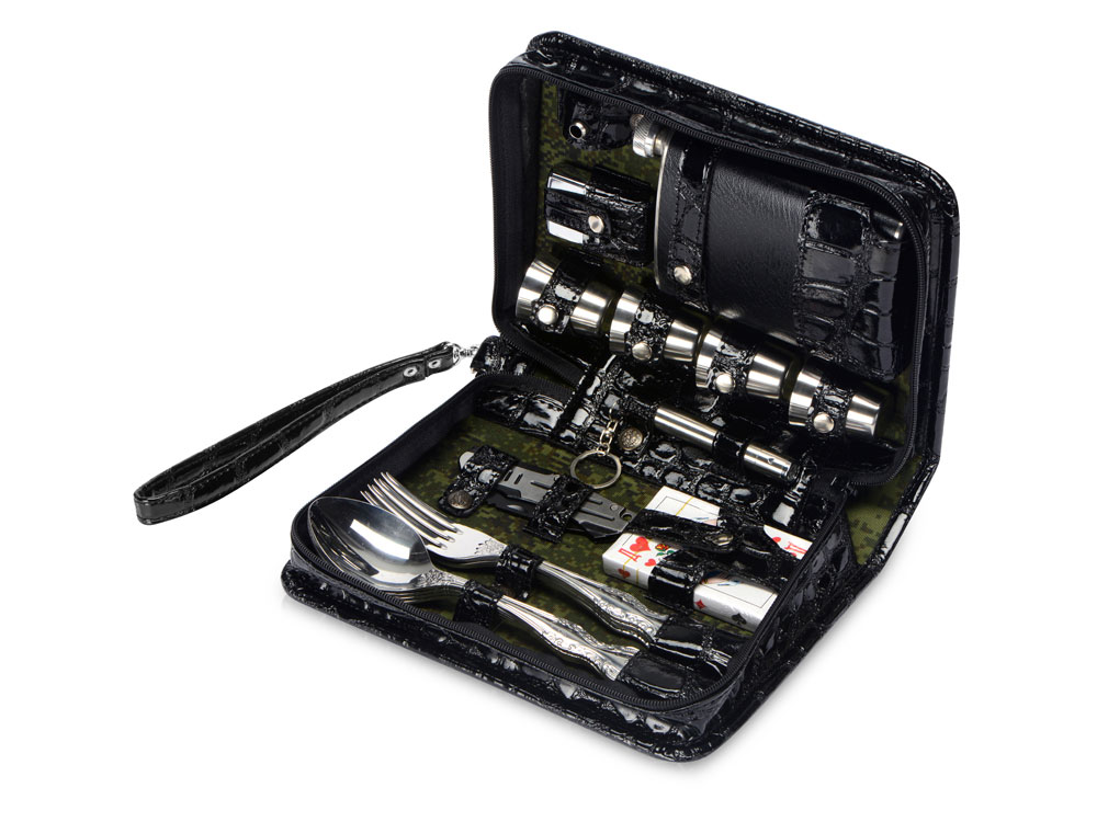 Оригинальный дорожный набор на 4 персоны в барсетке с удобным ремешком для переноски.