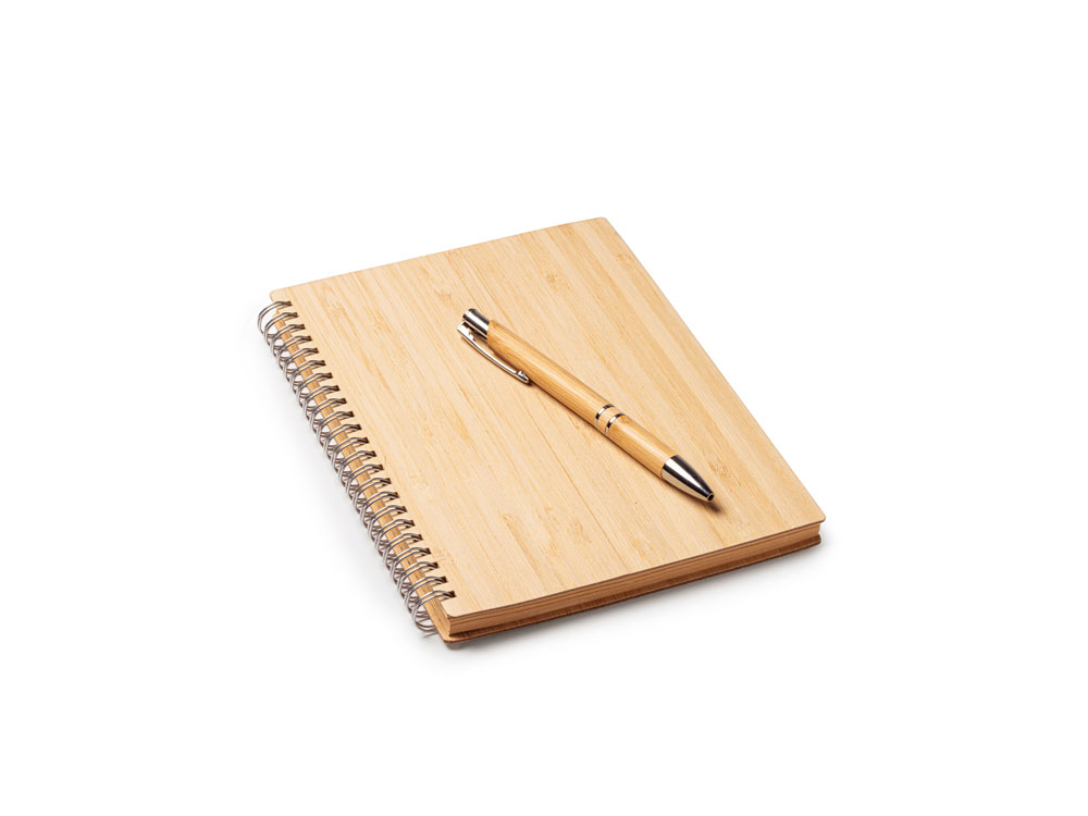 Блокнот и ручка из бамбука формата А5. Блокнот с твердой обложкой и 80 разлинованными листами из переработанной бумаги. Шариковая ручка с хромированными деталями и синими чернилами.