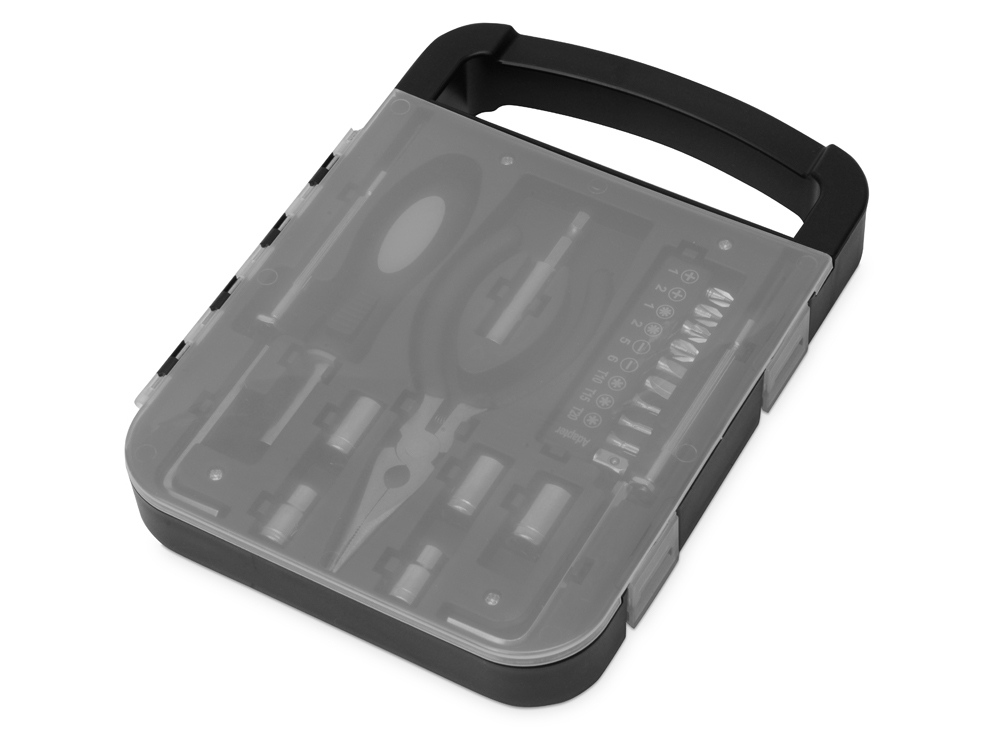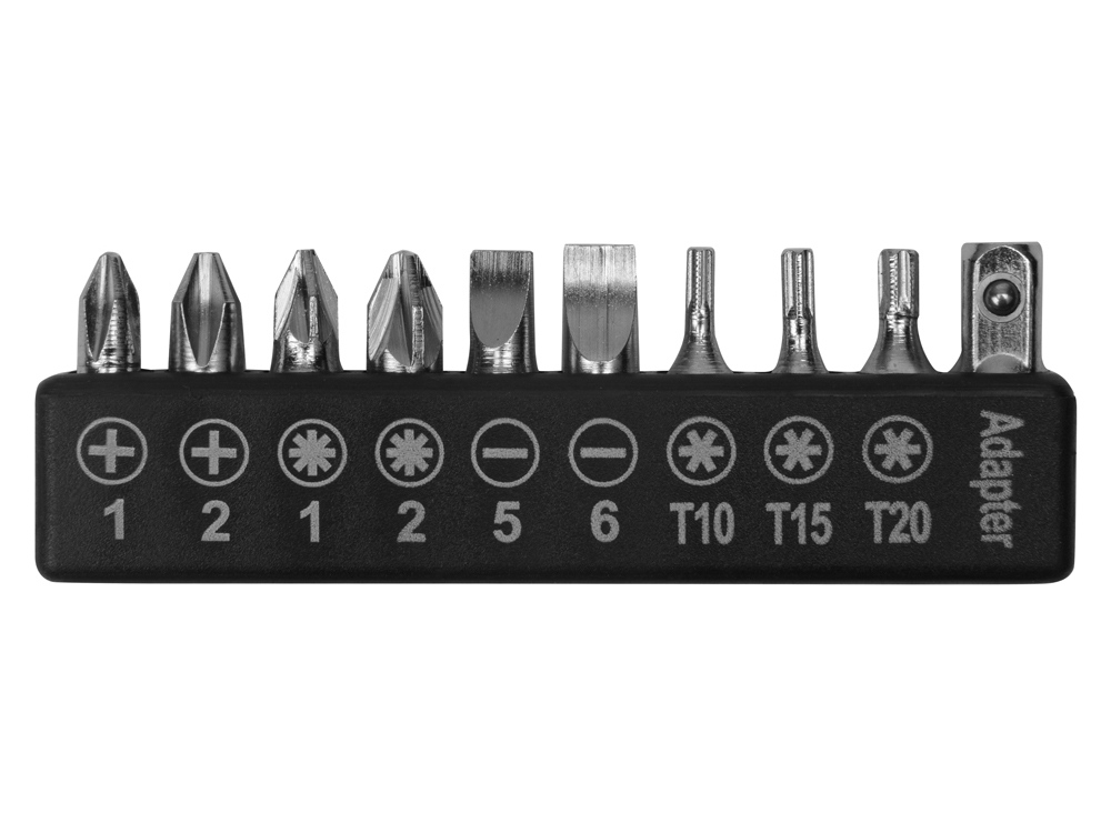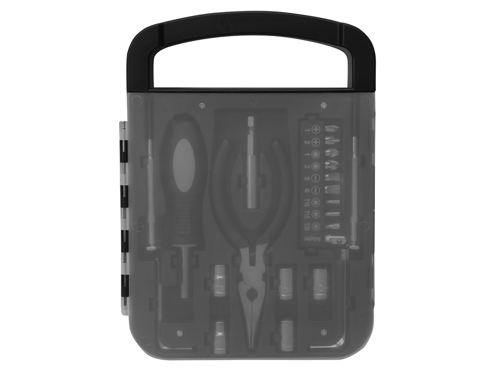 Набор инструментов в удобном пластиковом кейсе, состоит из 6 инструментов и 16 насадок: — Плоскогубцы — Отвертка с удлиннителем — 2 шестигранника — 2 тонких отвертки — 6 головок гаечных торцевых ключей (6/7/8/9/10 мм) — 9 бит + адаптер