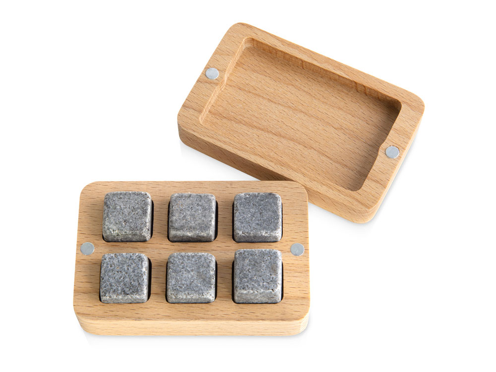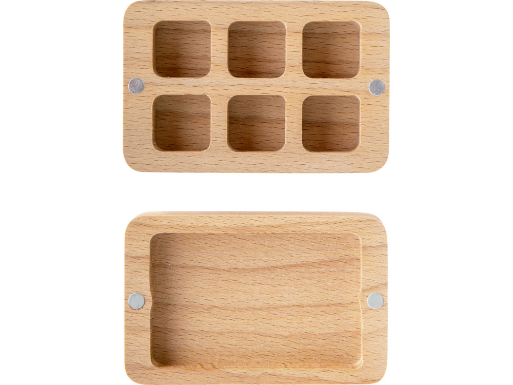 Подарочная коробка из бука не только позволит преподнести набор должным образом, но и поможет обладателю в дальнейшем правильно хранить камни. Коробка-футляр состоит из двух половинок с отверстиями под каждый камень, закрывается на 8 магнитов, закрепленных по углам половинок.